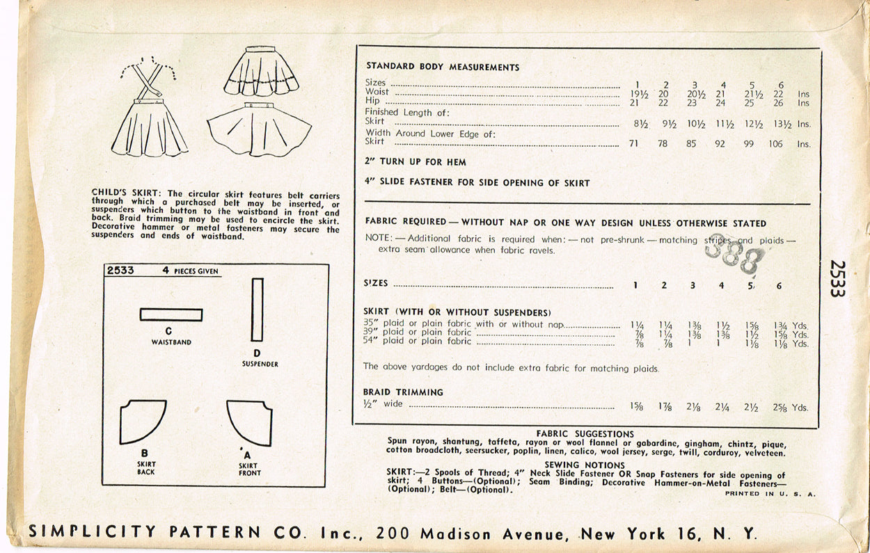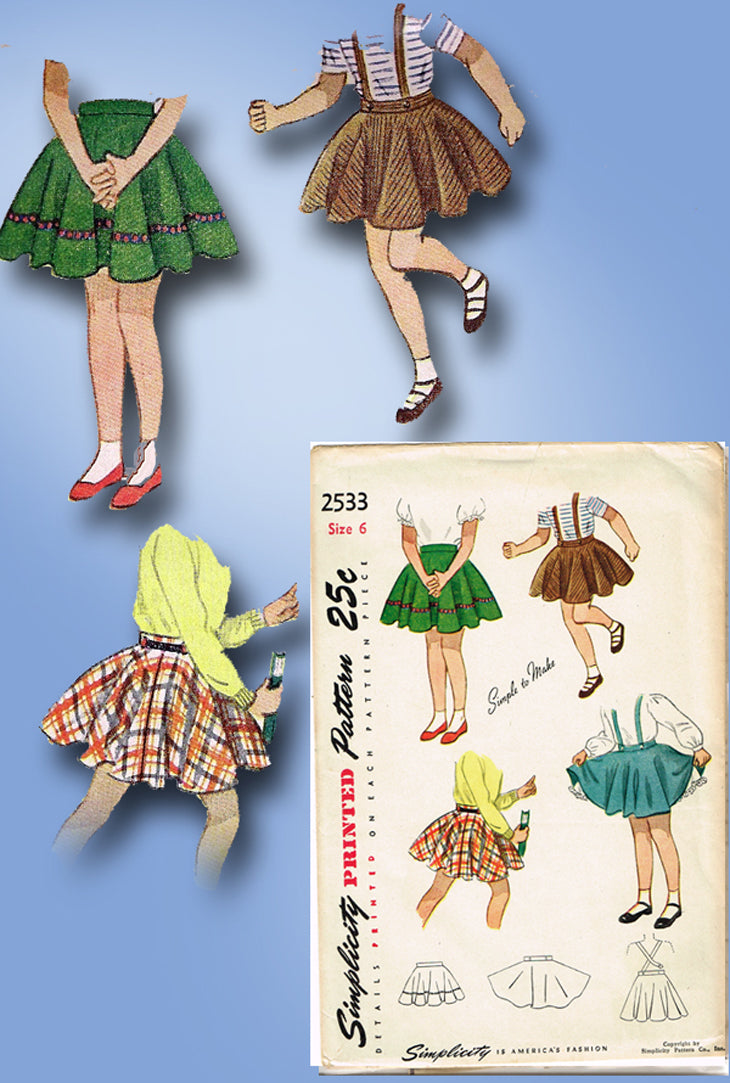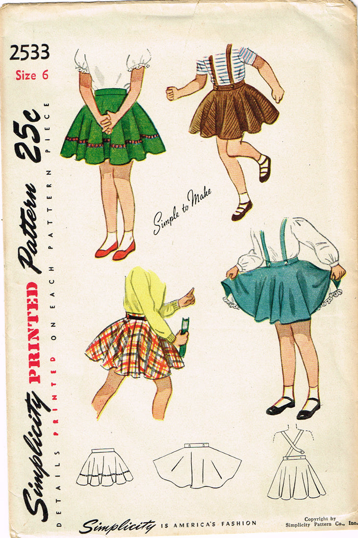 1940s Vintage Simplicity Sewing Pattern 2533 Easy to Make Toddler Girls Skirt Sz 6