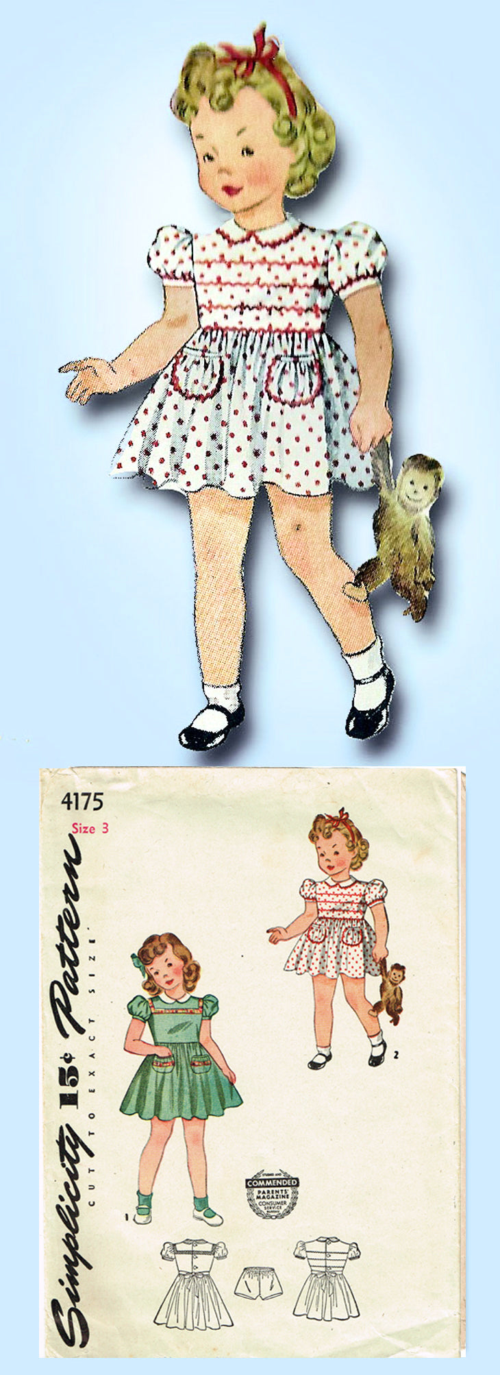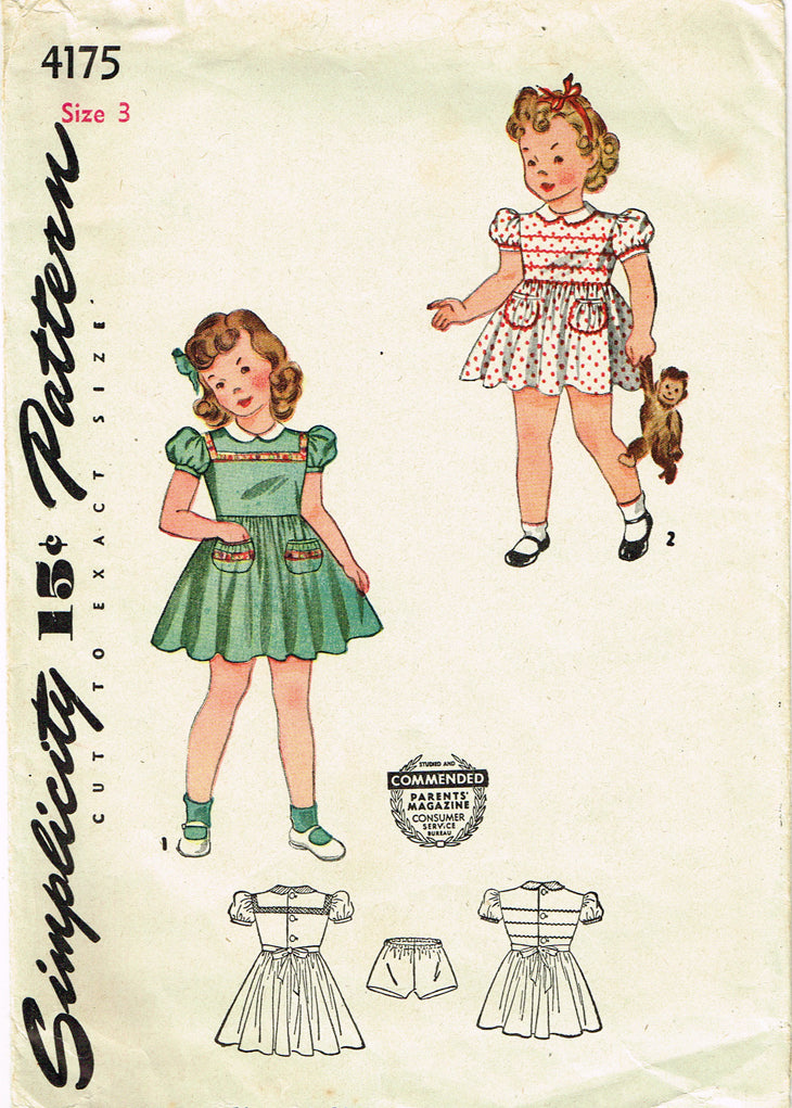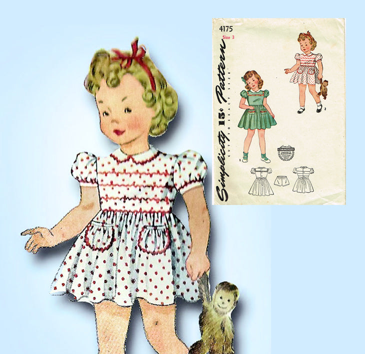 1940s Vintage Simplicity Sewing Pattern 4175 Cute Toddler Girls WWII Dress Sz 3