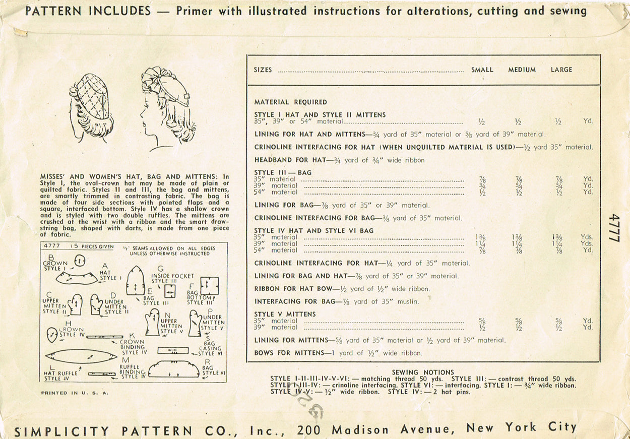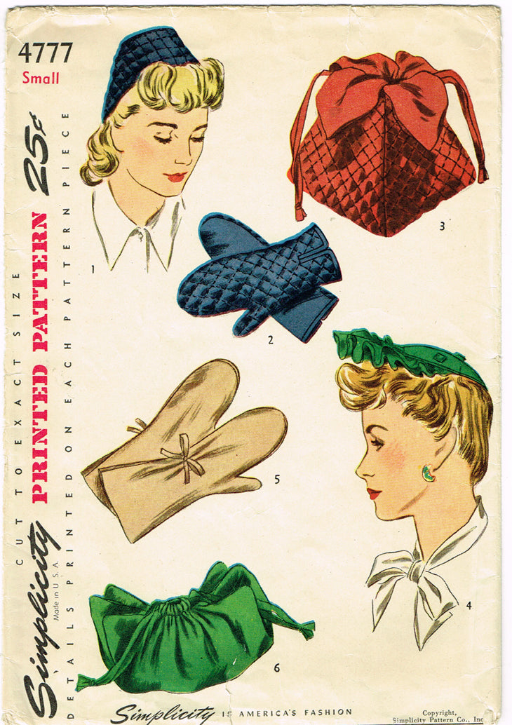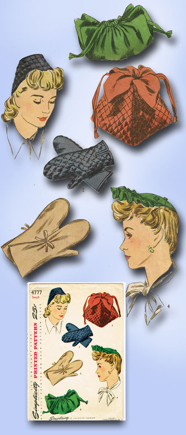 1940s Vintage Simplicity Sewing Pattern 4777 Charming WWII Hat Purse Mittens Sz Med