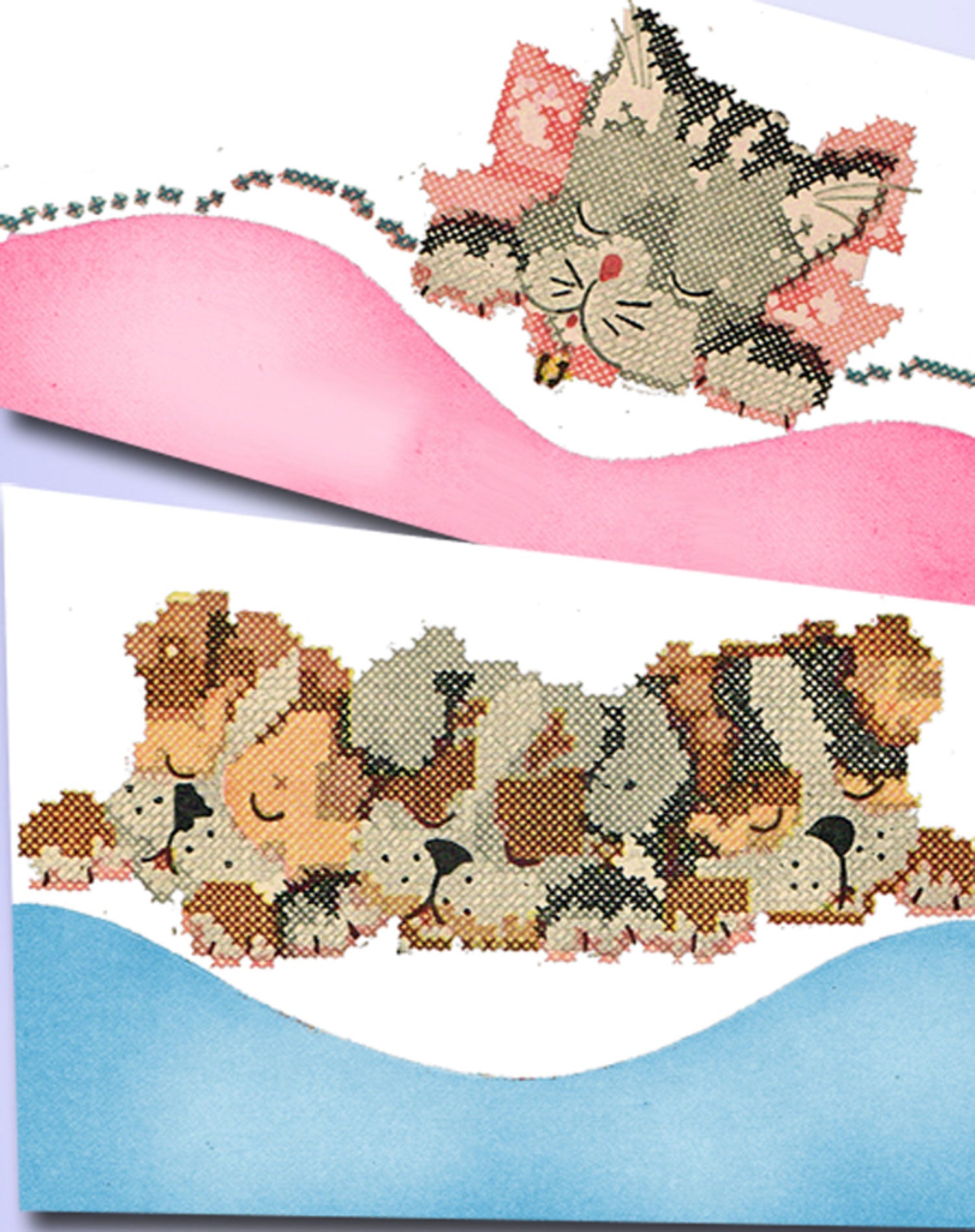 This charming transfer pattern for kids sheets and pillowcases. The sweet puppies and kittens are done in cross stitch and look so peaceful sleeping on the border of sheets and pillowcases.