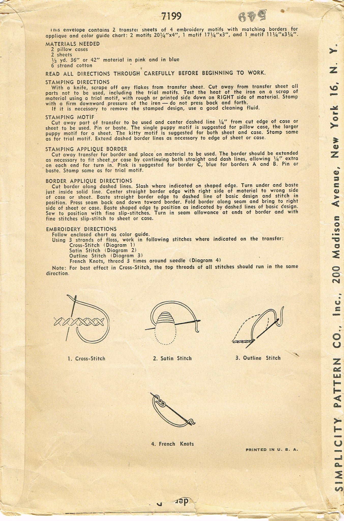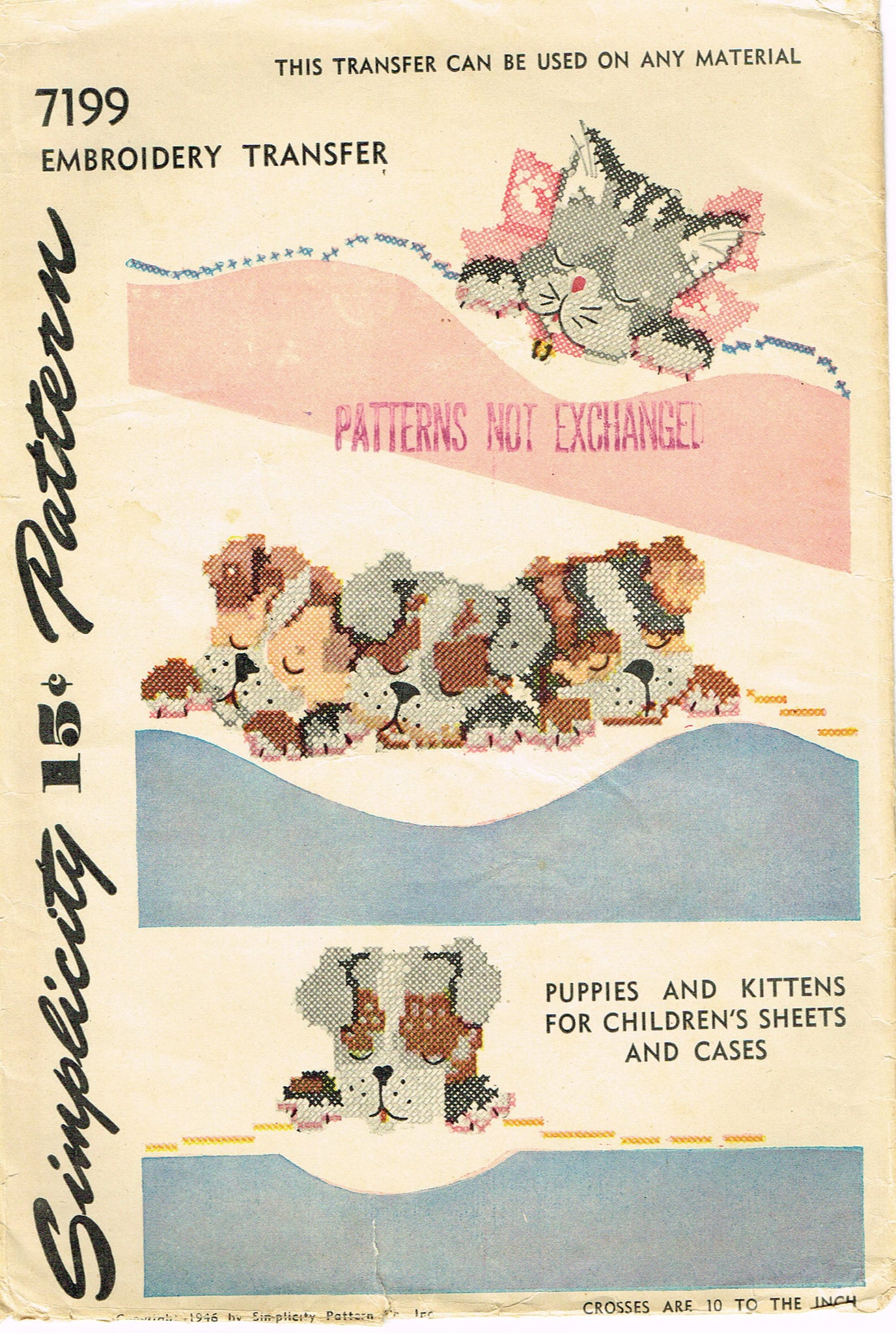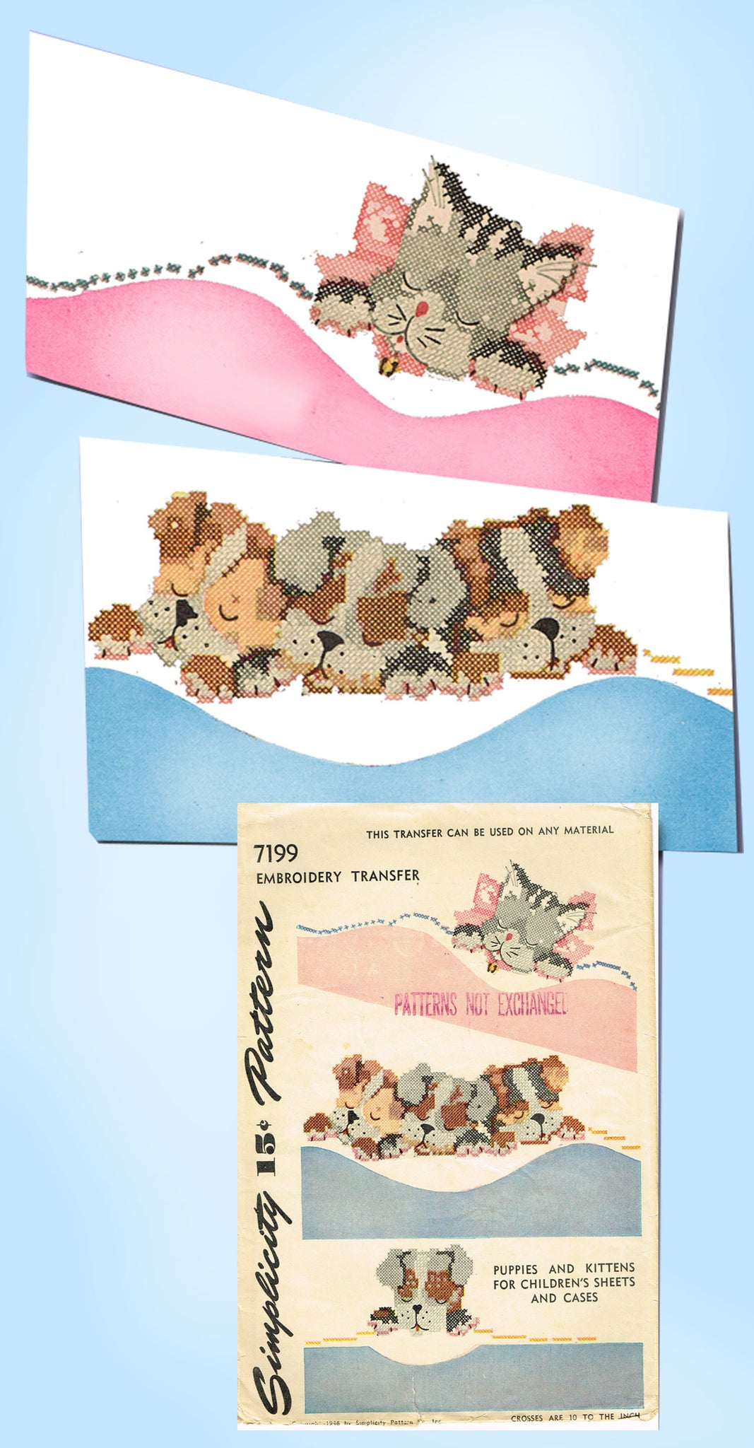 1940s Vintage Simplicity Transfer Pattern 7199 Uncut Cross Stitch Kitten Pcases