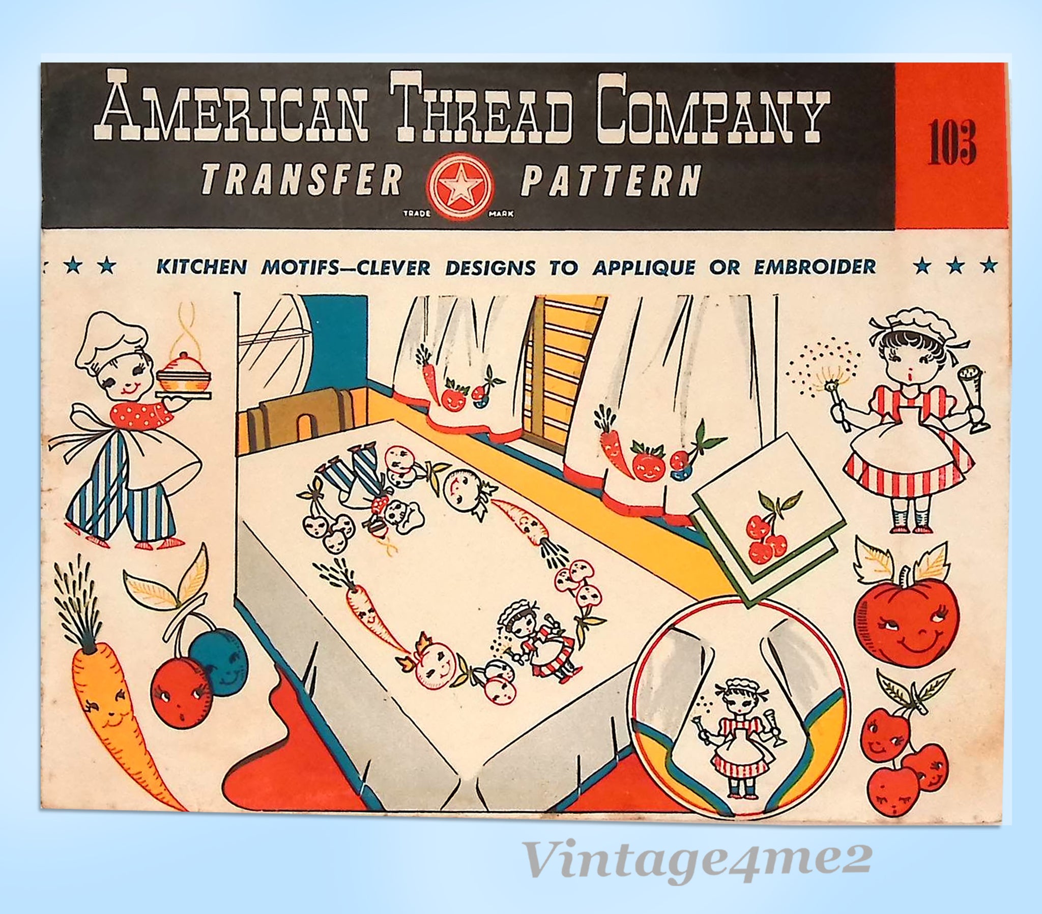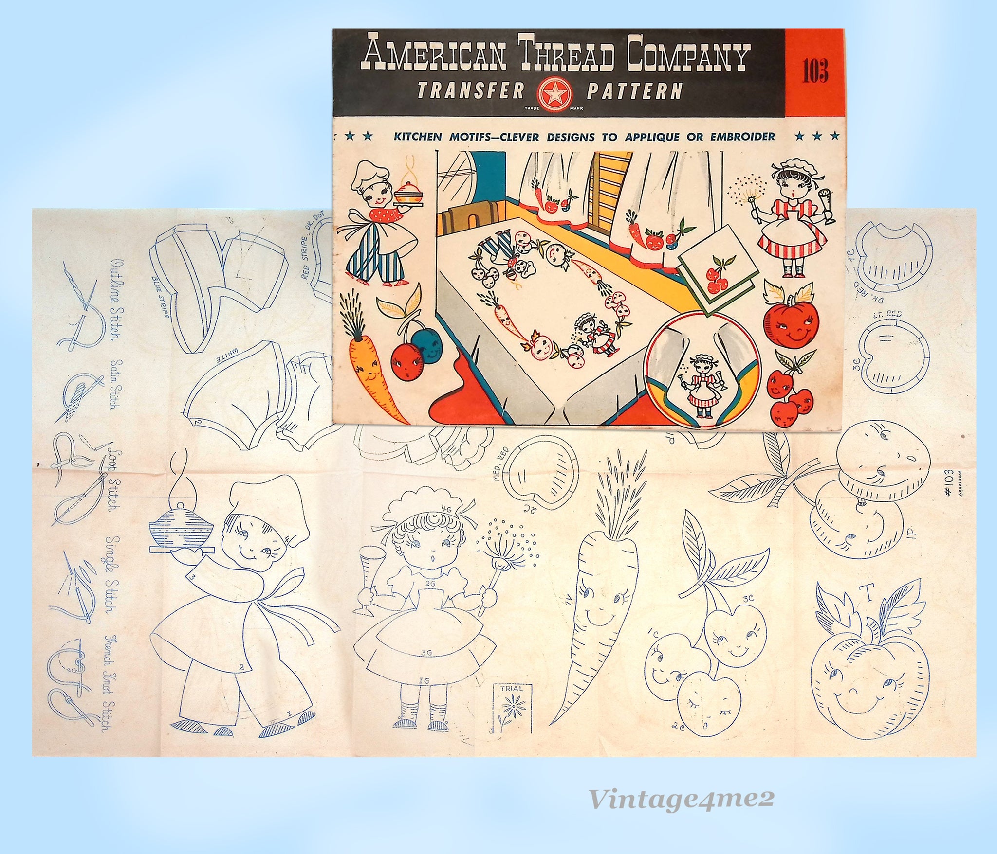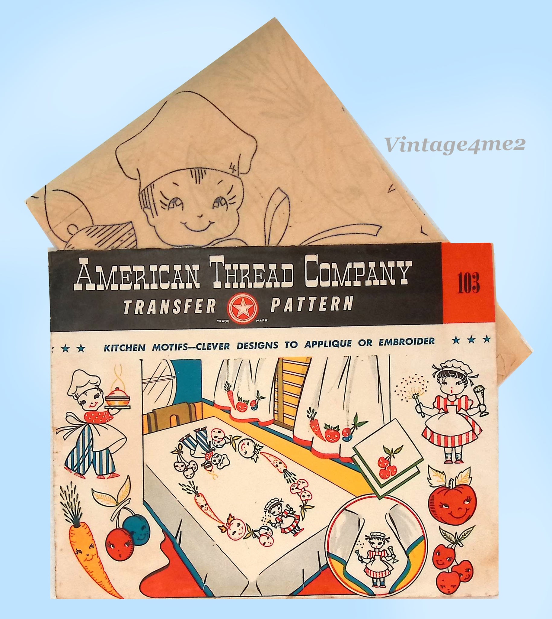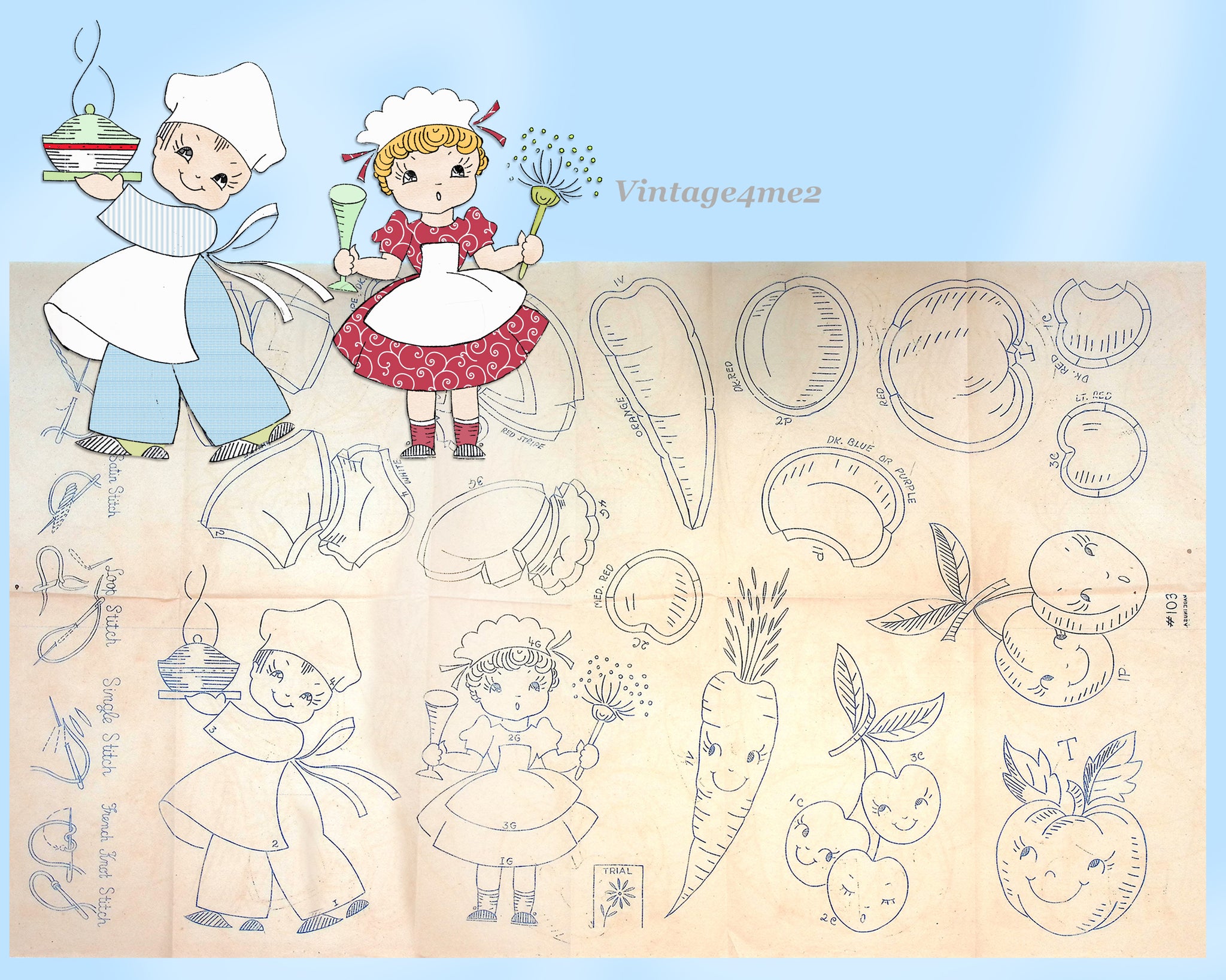 This cute tea towel transfer from Vogart features an adorable Chef and Maid. This is one of my favorite transfers and it is hard to find. It features comic cute chef and maid motifs with smiling anthro veggies. It can be done with a combination of embroidery and applique. Great for tea towels, cafe curtains, aprons, table cloths and napkins. It is factory folded and unused and comes in the original 1940s envelope with black top band.