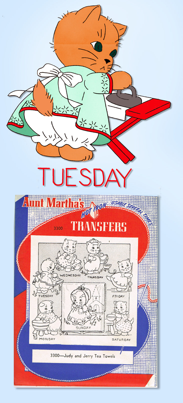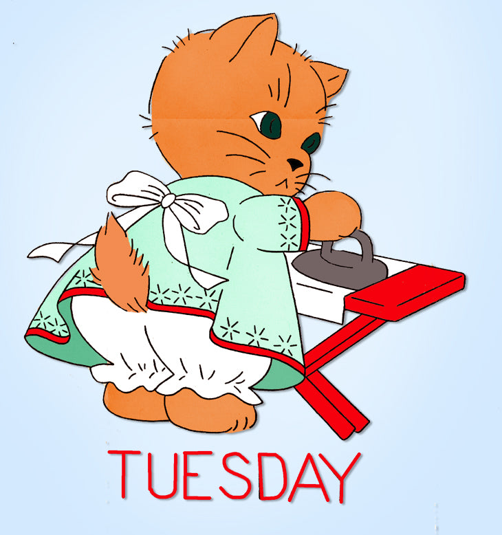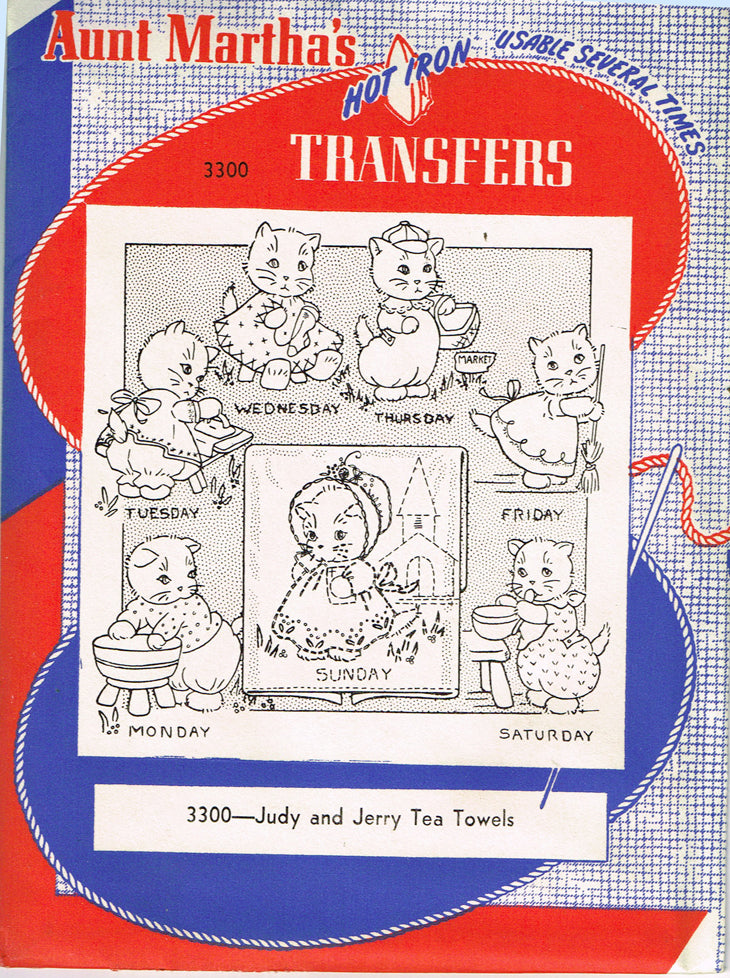Day of the Week "Judy and Jerry" Tea Towels This is a darling transfer from Aunt Martha's in the 1960s. This transfer is called "Judy and Jerry Tea Towels" and features a chore of the day design with a boy and girl kitten. This one is pretty rare and totally cute. I have a wonderful selections of transfers right now so be sure to check out our store. This transfer is uncut and unused. It comes in the original envelope from the 1960s. It is in nice condition. |