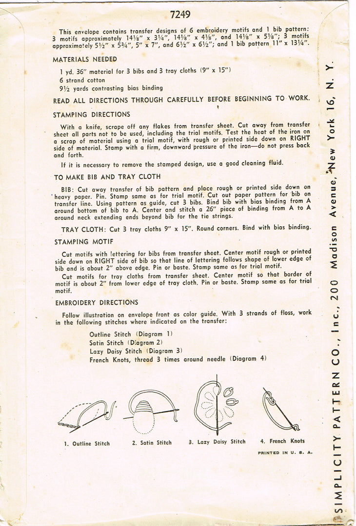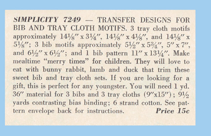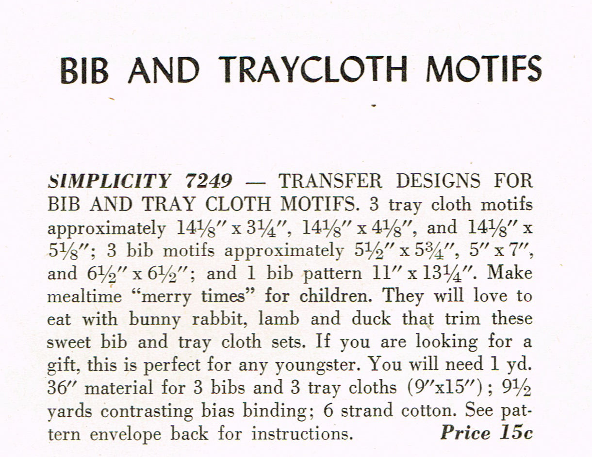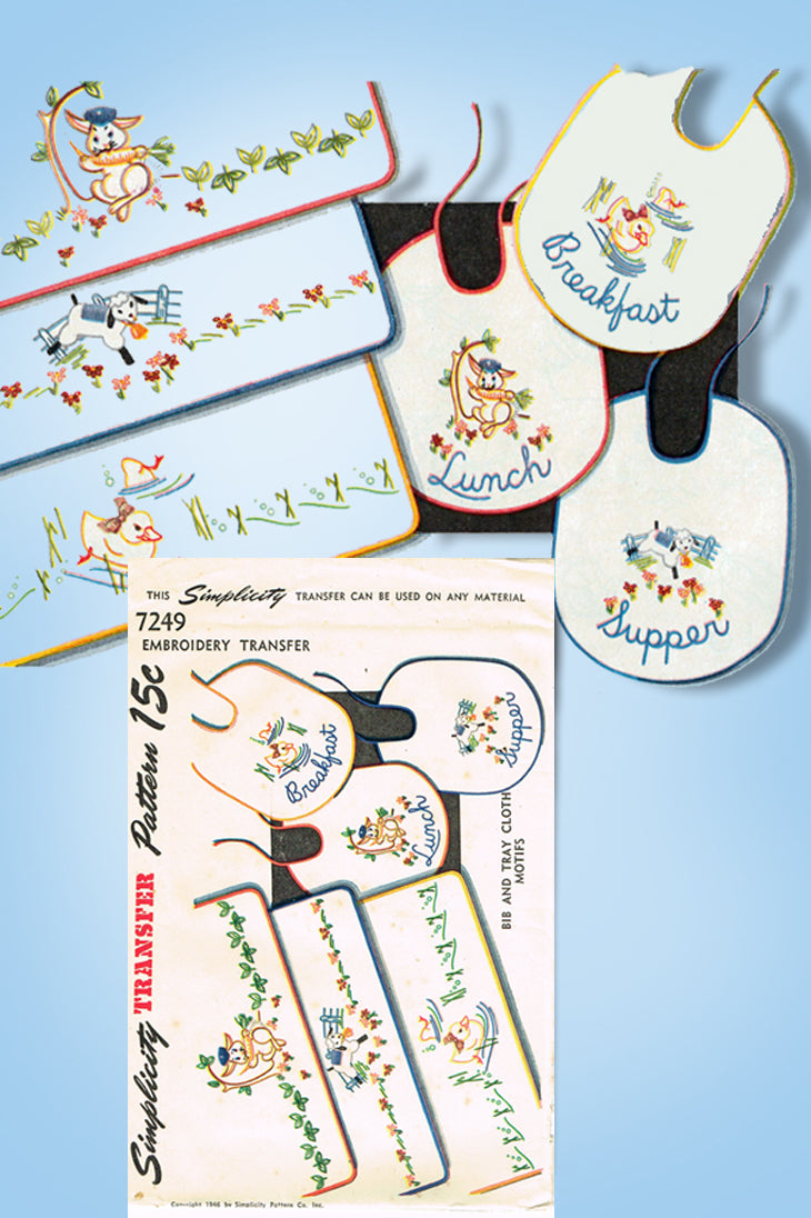 1940s VTG Simplicity Embroidery Transfer 7249 Uncut Baby Bib & Tray Cloth Motifs