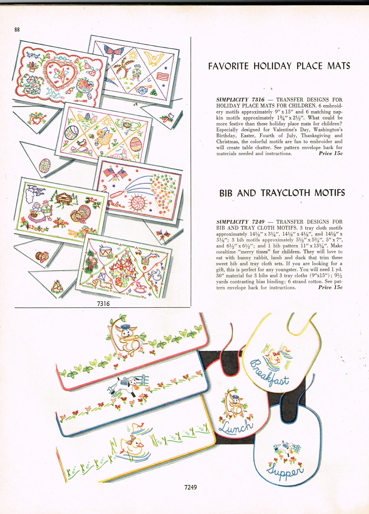 This is a wonderful vintage embroidery transfer from Simplicity in 1946, though we found it in a 1950 catalog. We have included the catalog pictures for your information but this does not come with the actual pages. This transfer has three sweet bib motifs for "Breakfast" "Lunch" and "Supper". Factory folded and uncut transfer in nice condition. Comes with the original envelope.
