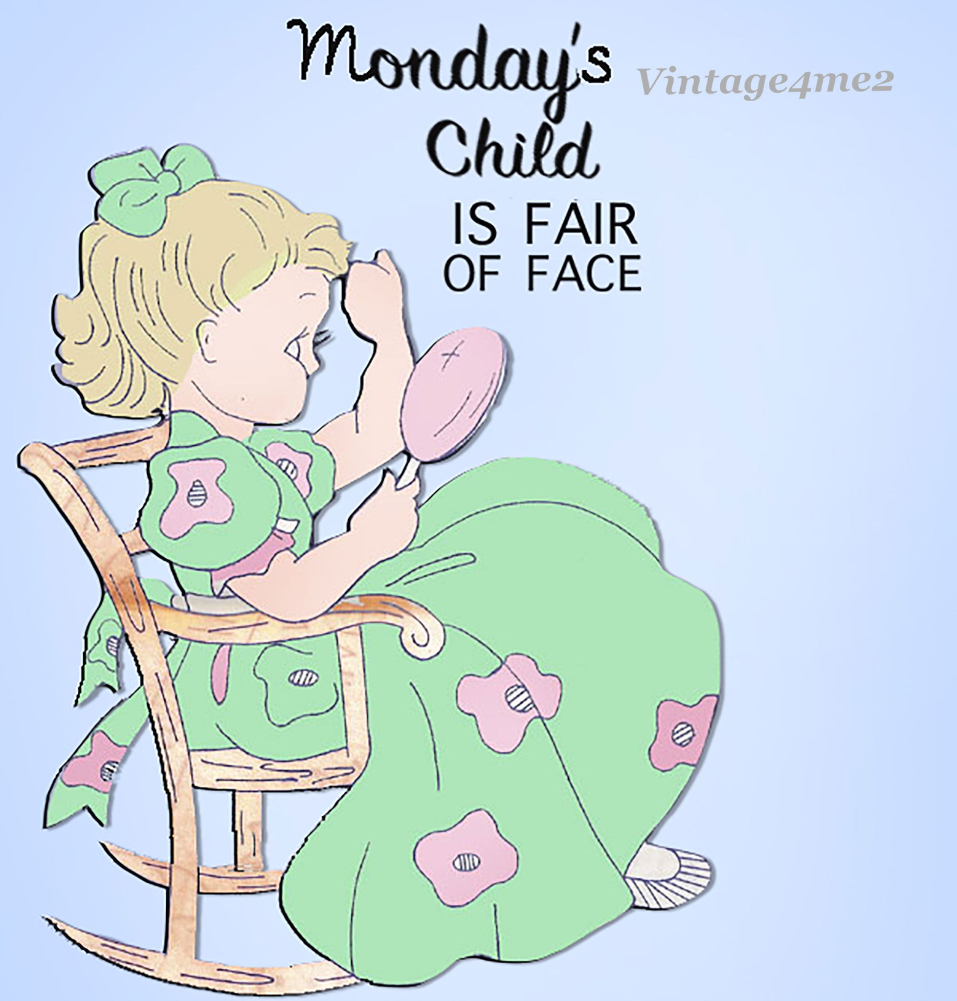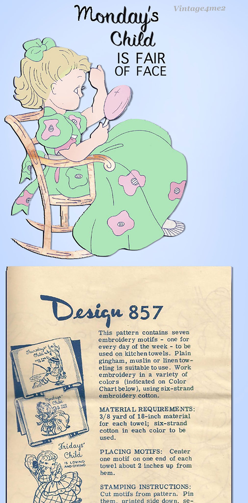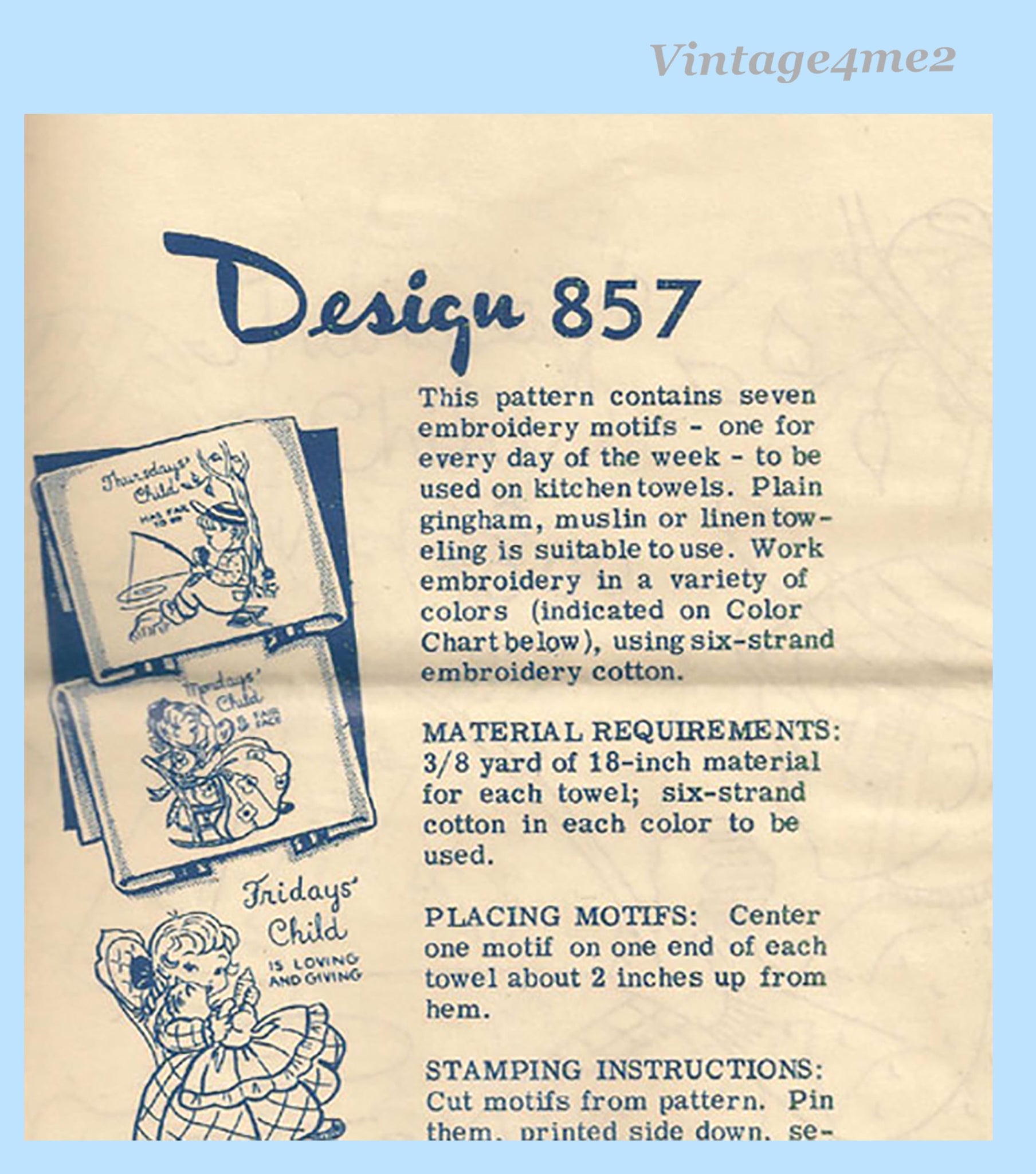 1950s Design Mail Order Embroidery Transfer 857 Uncut Mondays Child Tea Towels