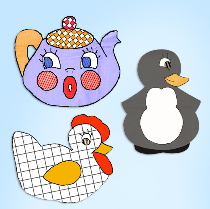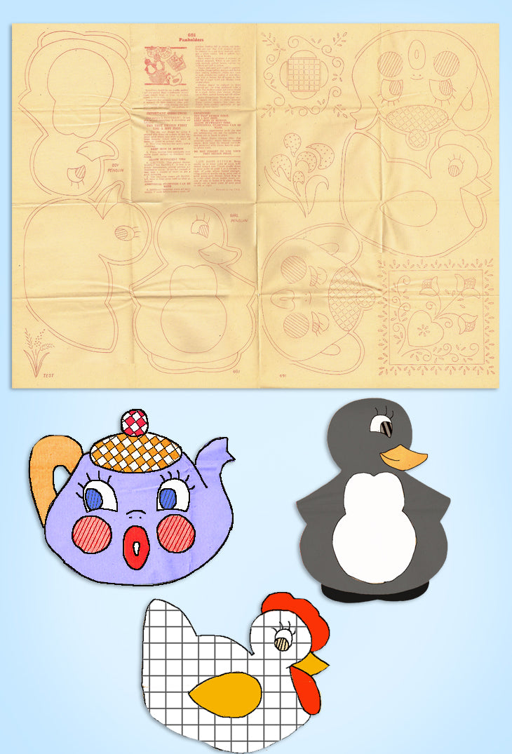 This transfer has cute potholders; penguins, ducks, chickens and tea pots.  This transfer is uncut and unused, but did not come with an envelope.