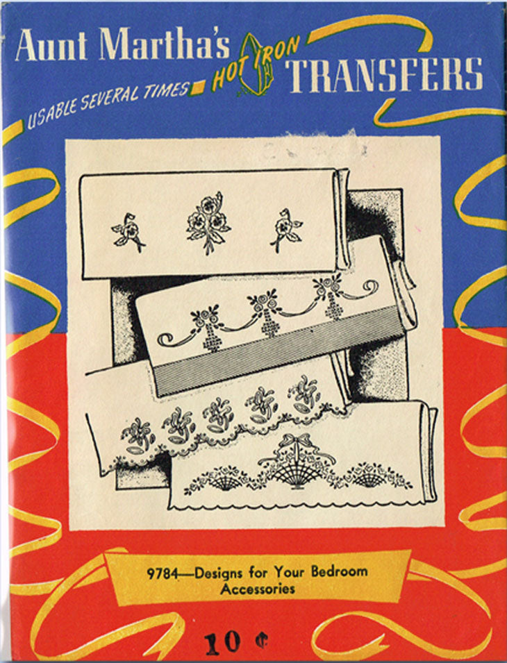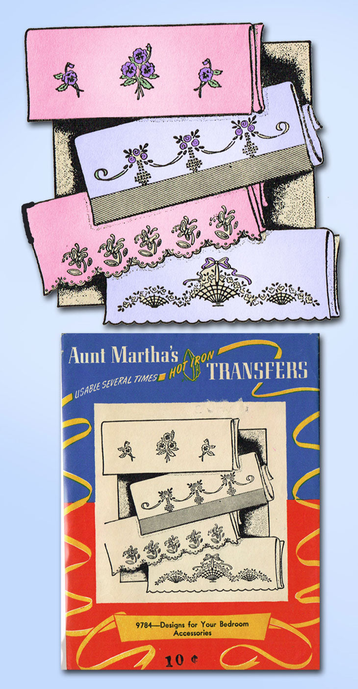 This is a charming vintage transfer. I am sure this is Aunt Martha's 9784 from the 1950s.  This is uncut, unused and still factory folded. This transfer has four different floral designs for pillowcase motifs.  This 1950s transfers comes in the original envelope.