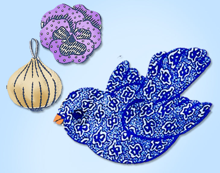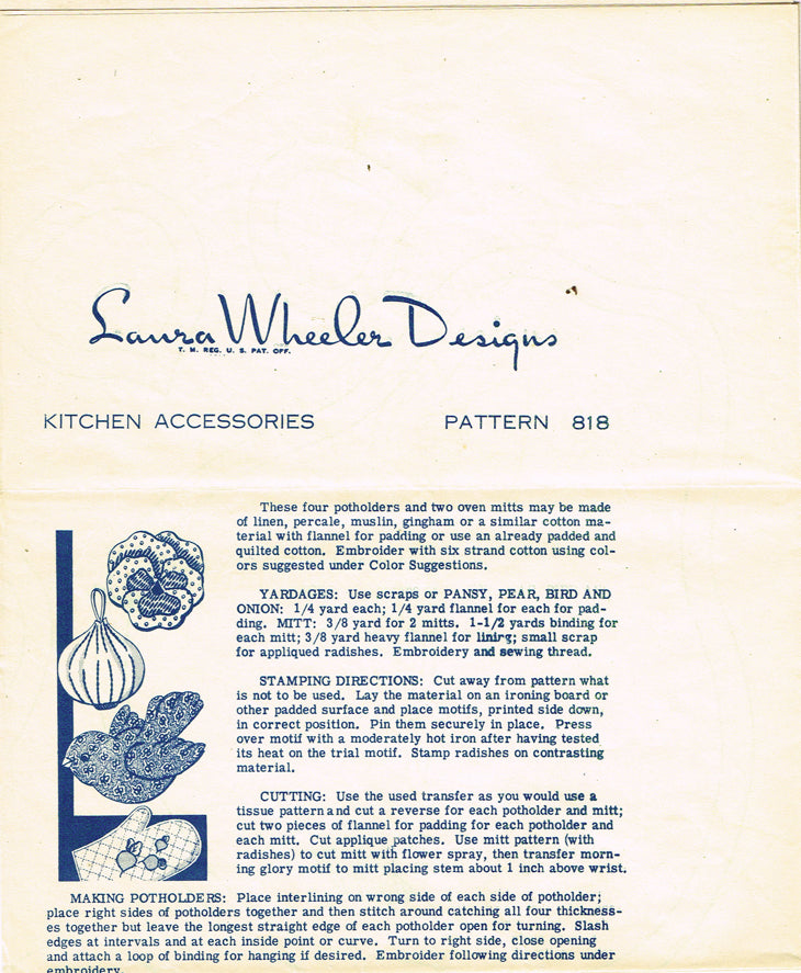 This transfer has cute potholders; I see a bird done in applique and a flower that I think is a pansy.  This transfer is uncut and unused, but did not come with an envelope.