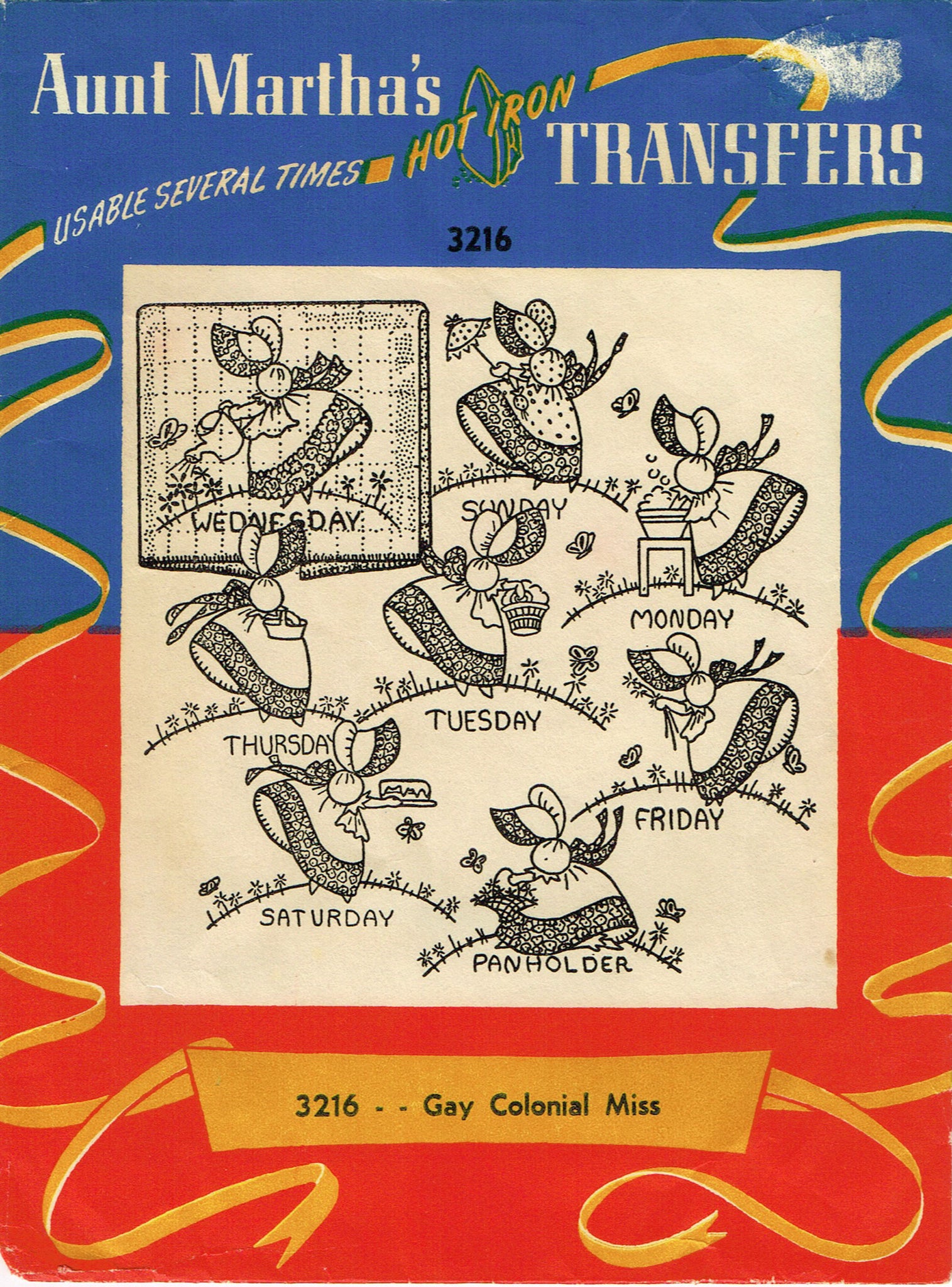 This is a wonderful vintage hot iron transfer from the Aunt Martha Hot Iron Transfer company in the 1950s. This transfer has a chore of the day format with a Sun Bonnet Sue, she is called a "Gay Colonial Miss" on the front of the envelope. This transfer is factory folded and unused. It comes in the red and blue envelope.