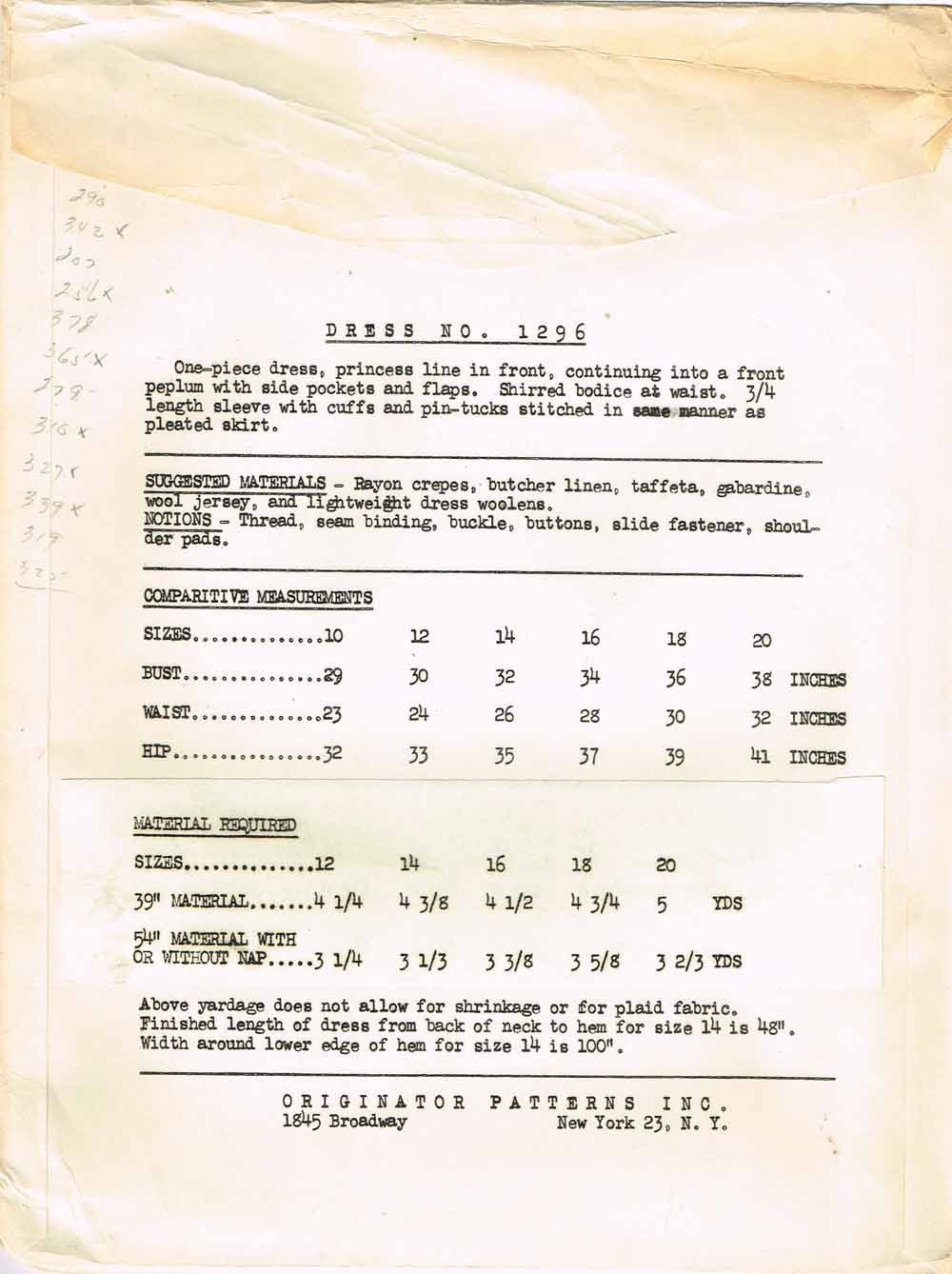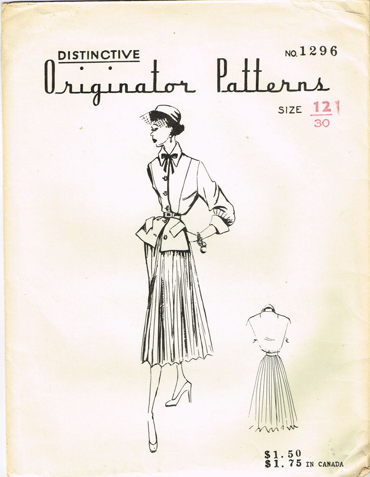 1950s Very Rare Originator Designer Pattern 1296 Uncut Misses One PC Dress Sz 12