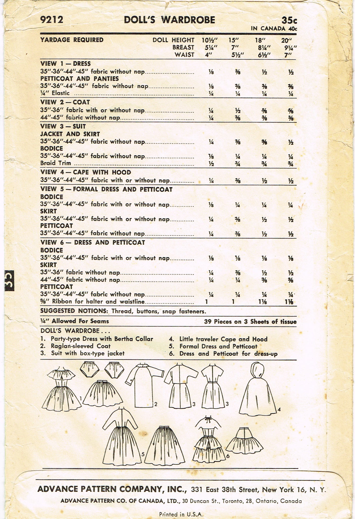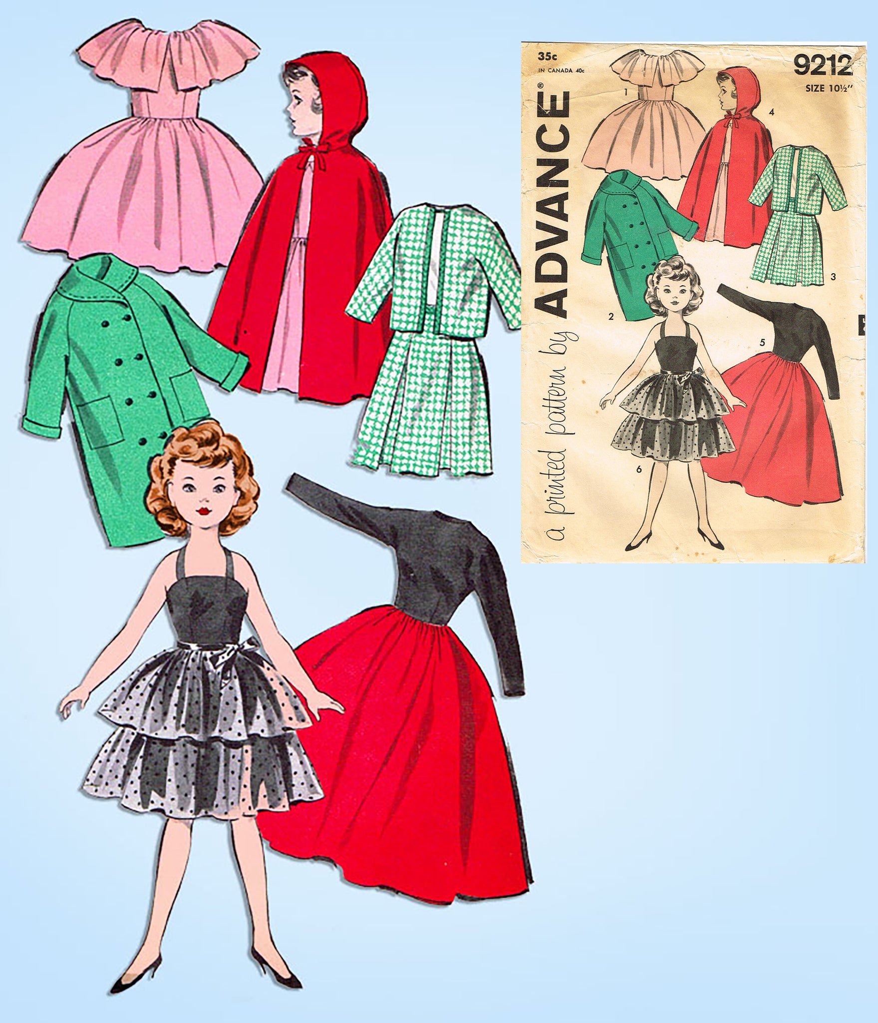 1950s Vintage Advance Sewing Pattern 9212 10 Inch High Heel Doll Clothes Set