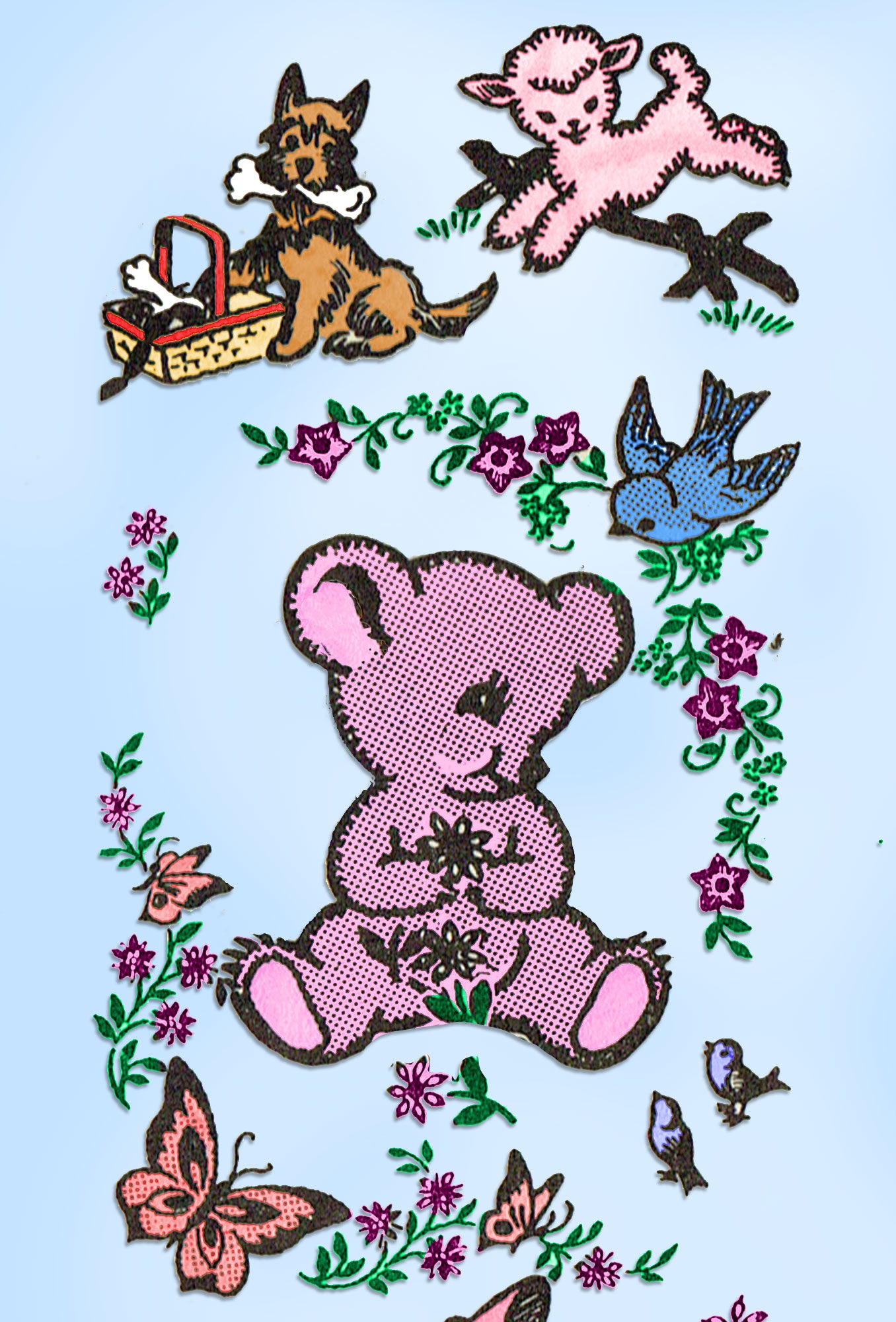 This transfer is a sweet Anne Cabot mail order embroidery pattern with baby animal motifs for kids rooms and clothes. There is a cute dog with a bone motif along with frolicking lambs and a teddy bear. It is a real one of a kind design.
