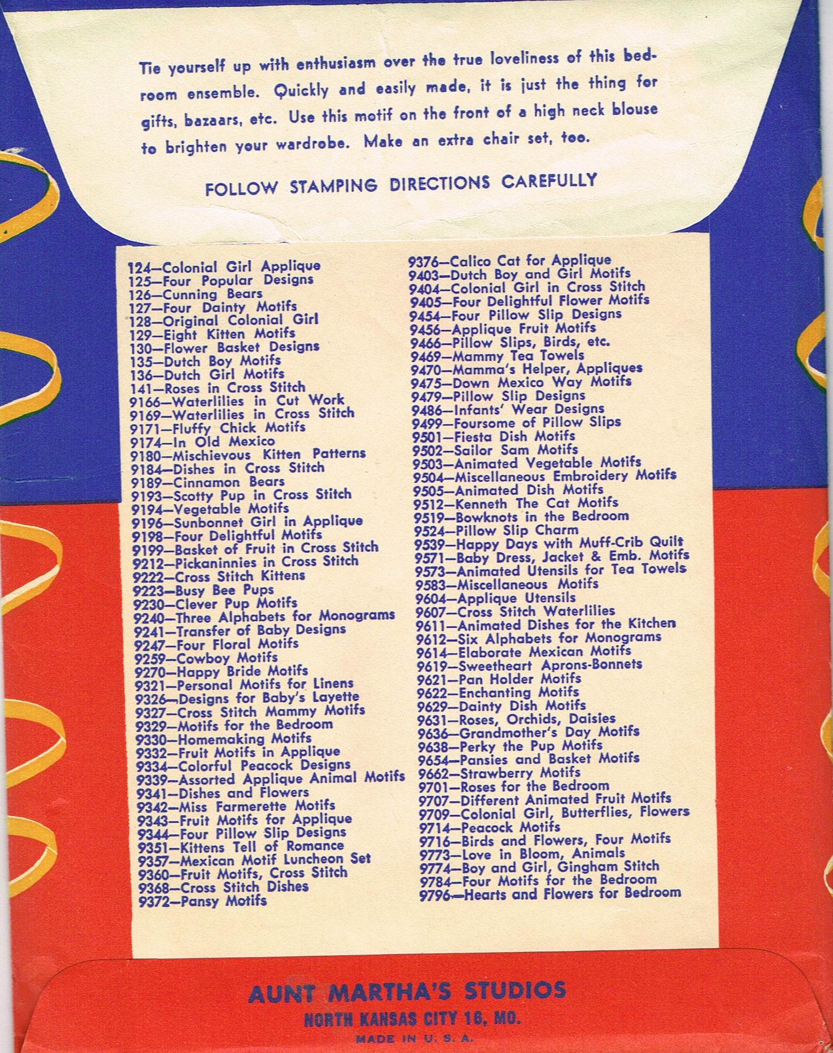 This is a charming vintage transfer. I am sure this is Aunt Martha's 9519 from the 1950s. This is uncut, unused and still factory folded. Included are darling designs for the best bed linen and towel ends. There are lovely designs for pillowcases or bathroom guest towels. This transfer is uncut and comes with the original red, blue and yellow envelope.