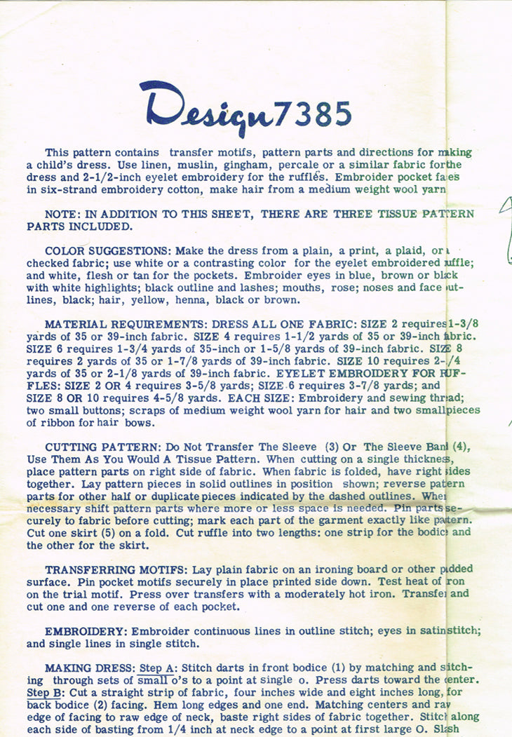 1950s Vintage Design Transfer Pattern 7385 Girls Dress w Doll Face Pockets Sz 10