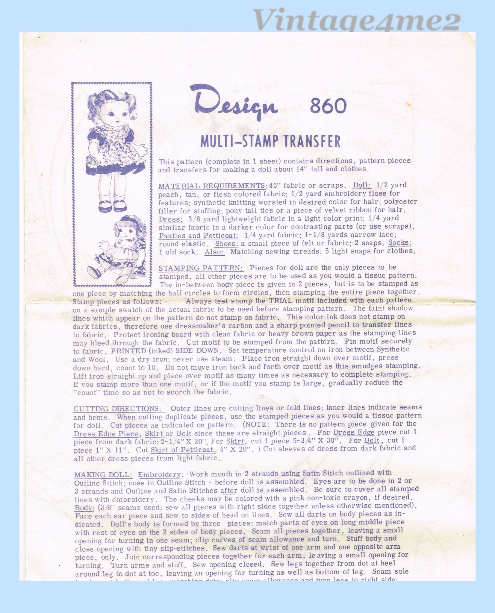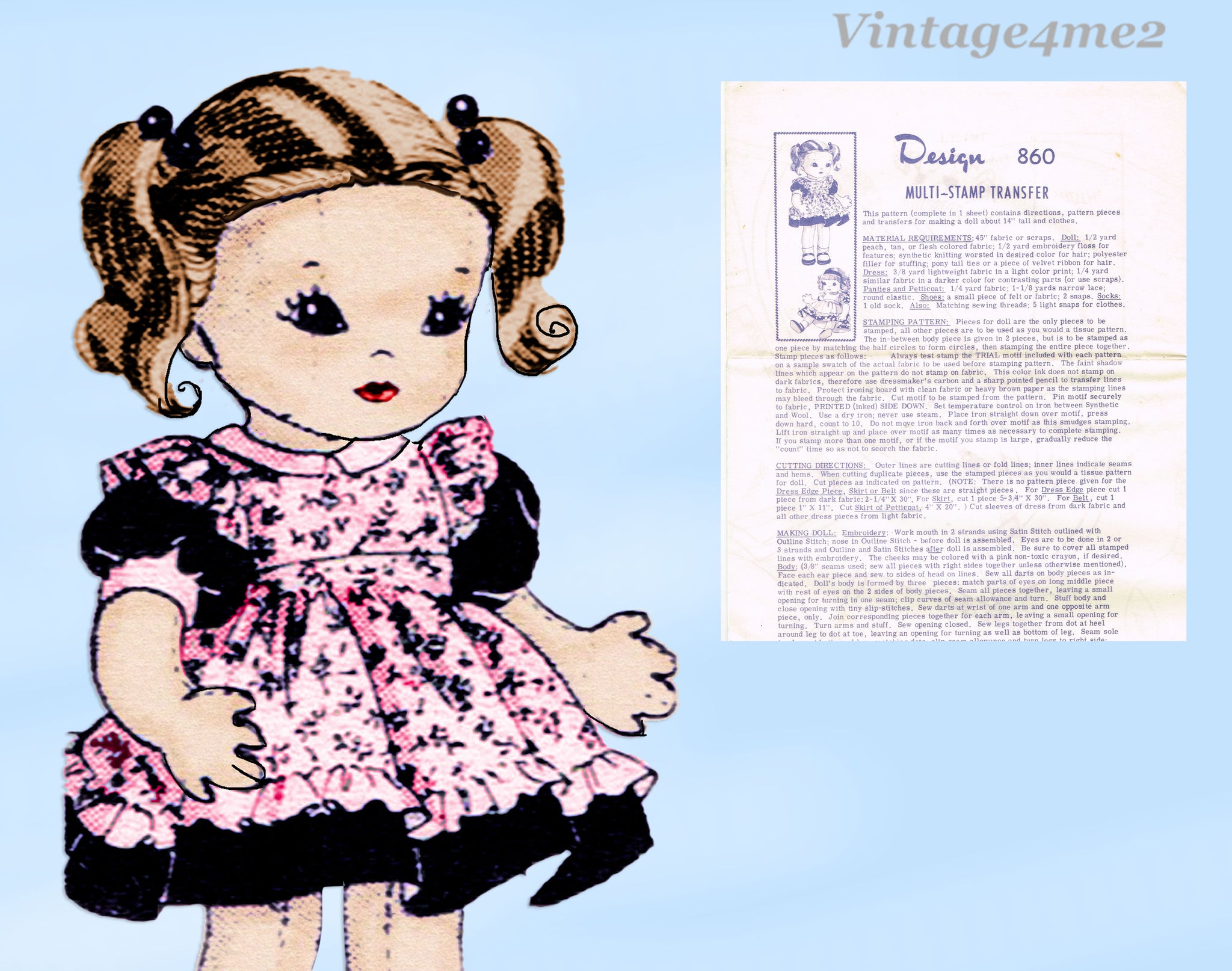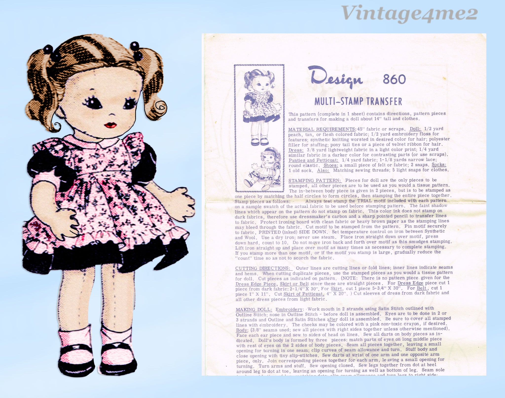 1950s Vintage Mail Order Sewing Pattern 860 Uncut 14in Soft Doll & Clothes