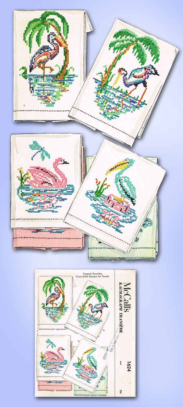 This is a charming transfer for the bathroom from McCall's in 1951. This cross stitch transfer is perfect addition to your tropical bathroom design. It has 6 designs, two each of a swan, pelican and a water bird that looks like a Flamingo. This transfer is factory folded, uncut and unused. It comes in the original envelope.