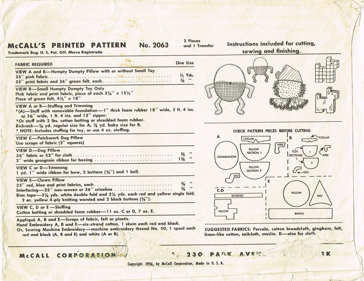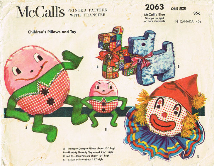 1950s Vintage McCalls Sewing Pattern 2063 Childs Stuffed Animal Pillows Dolls
