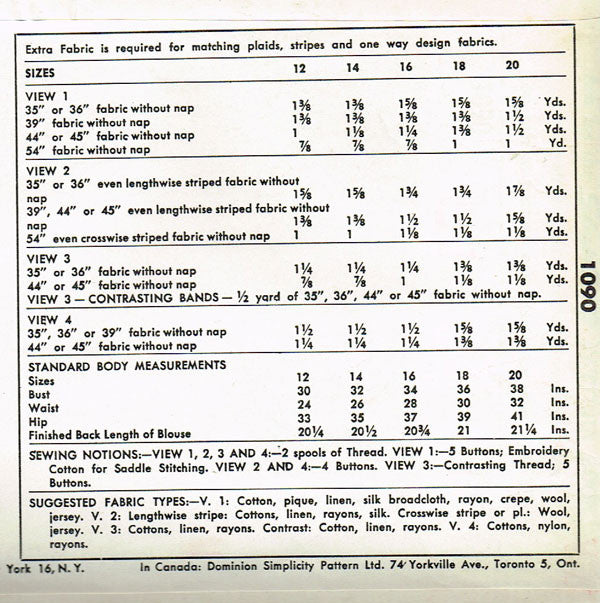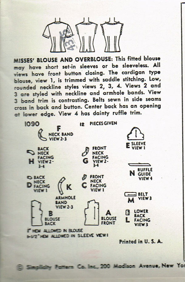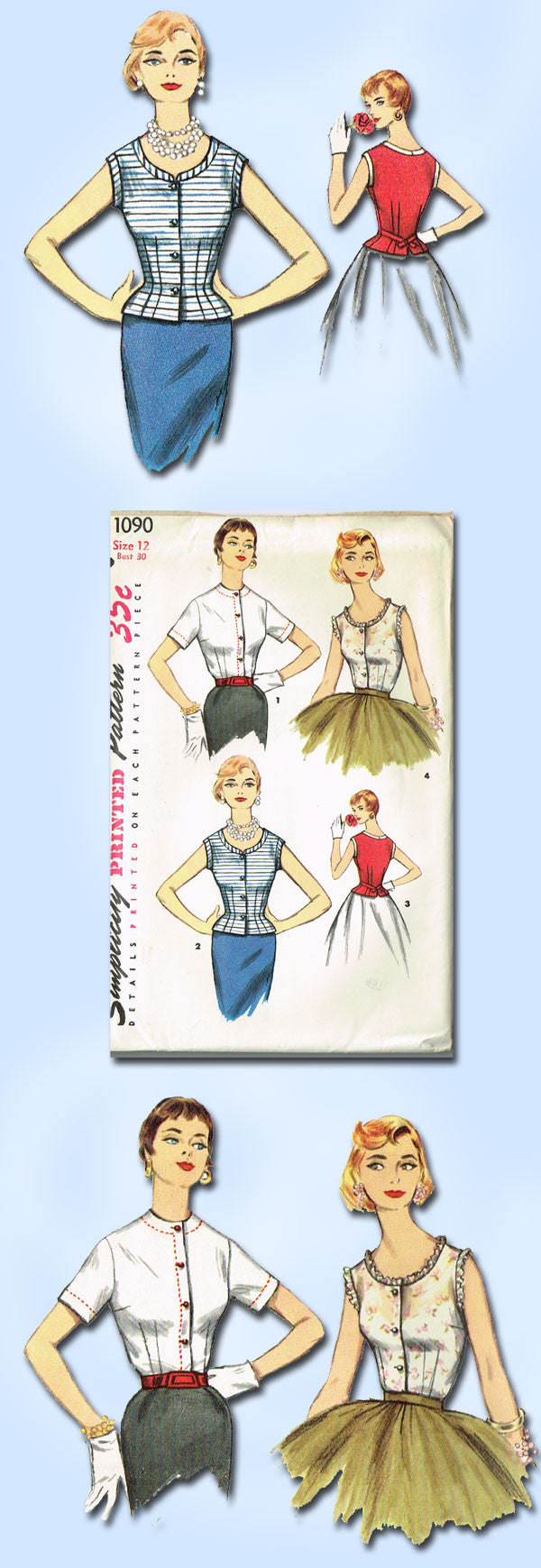 1950s Vintage Misses Blouse Uncut Simplicity Sewing Pattern 1090 Sz 12