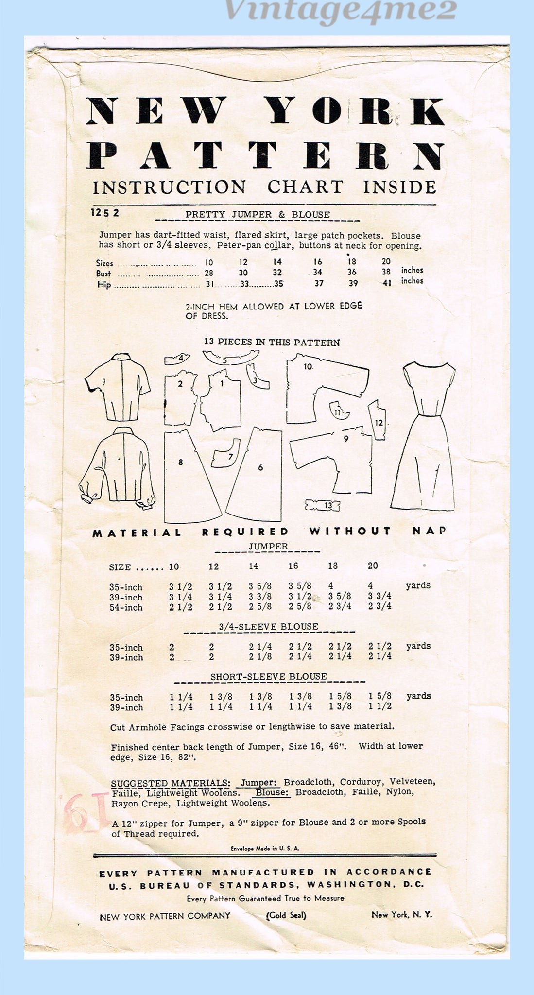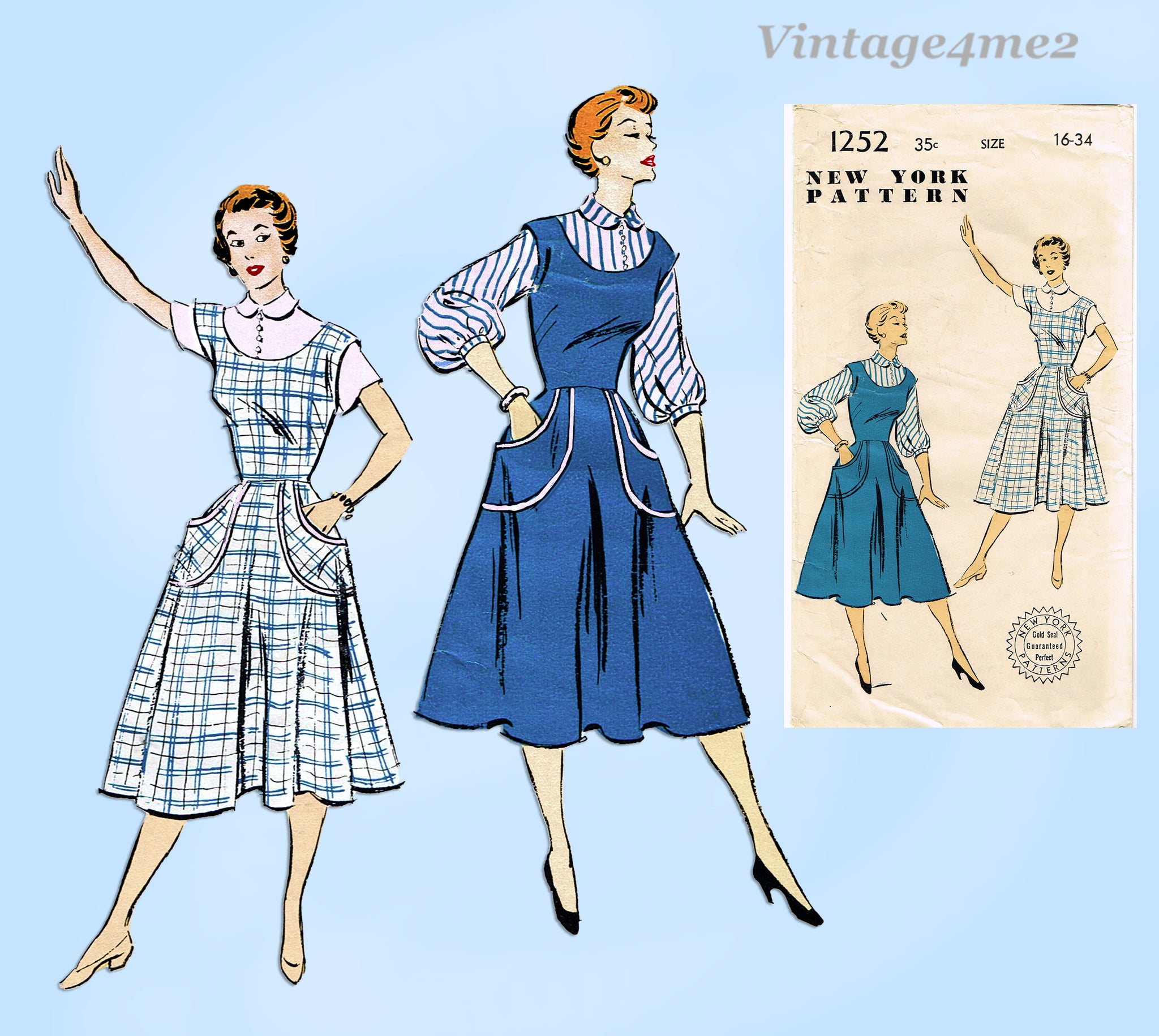 1950s Vintage New York Sewing Pattern 1252 Uncut Misses Jumper Dress Sz 34 Bust