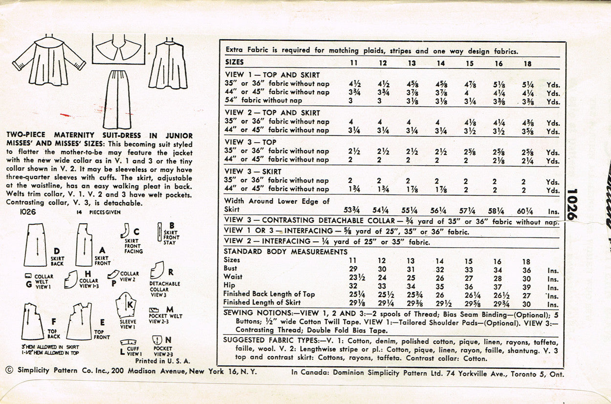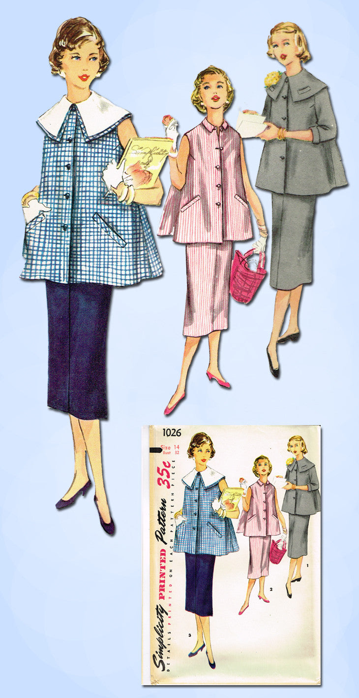 1950s Vintage Simplicity Sewing Pattern 1026 FF Misses Maternity Suit Sz 14 32B