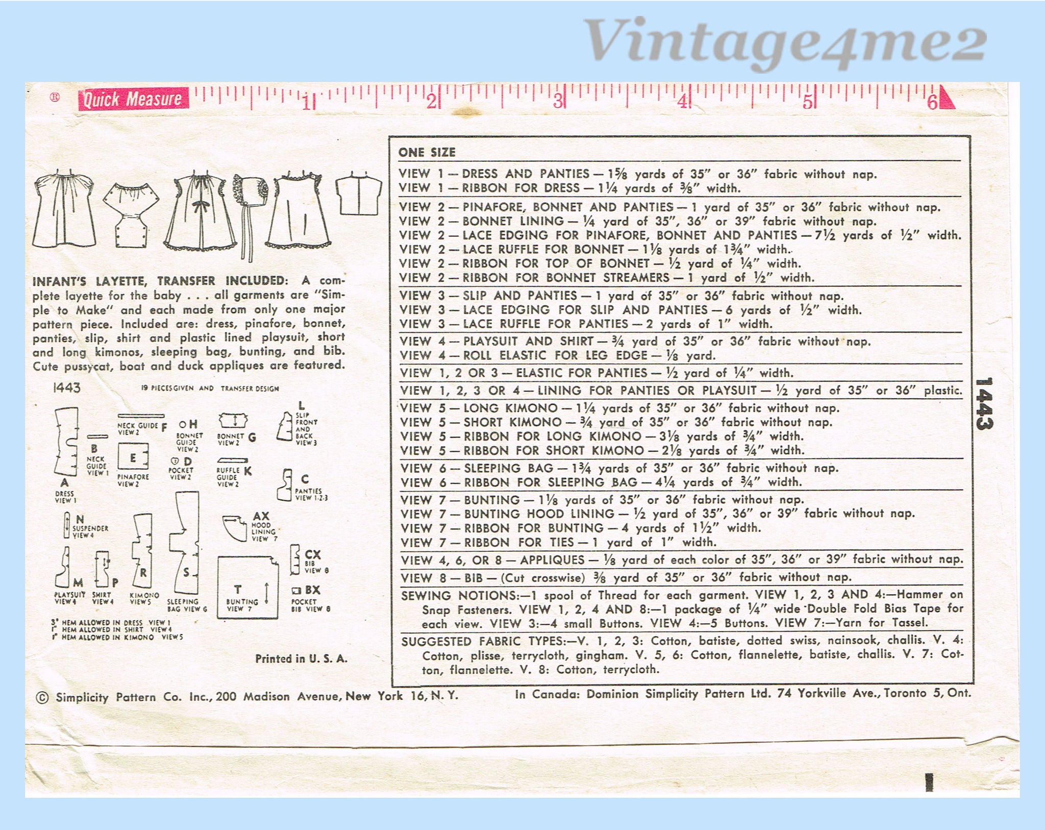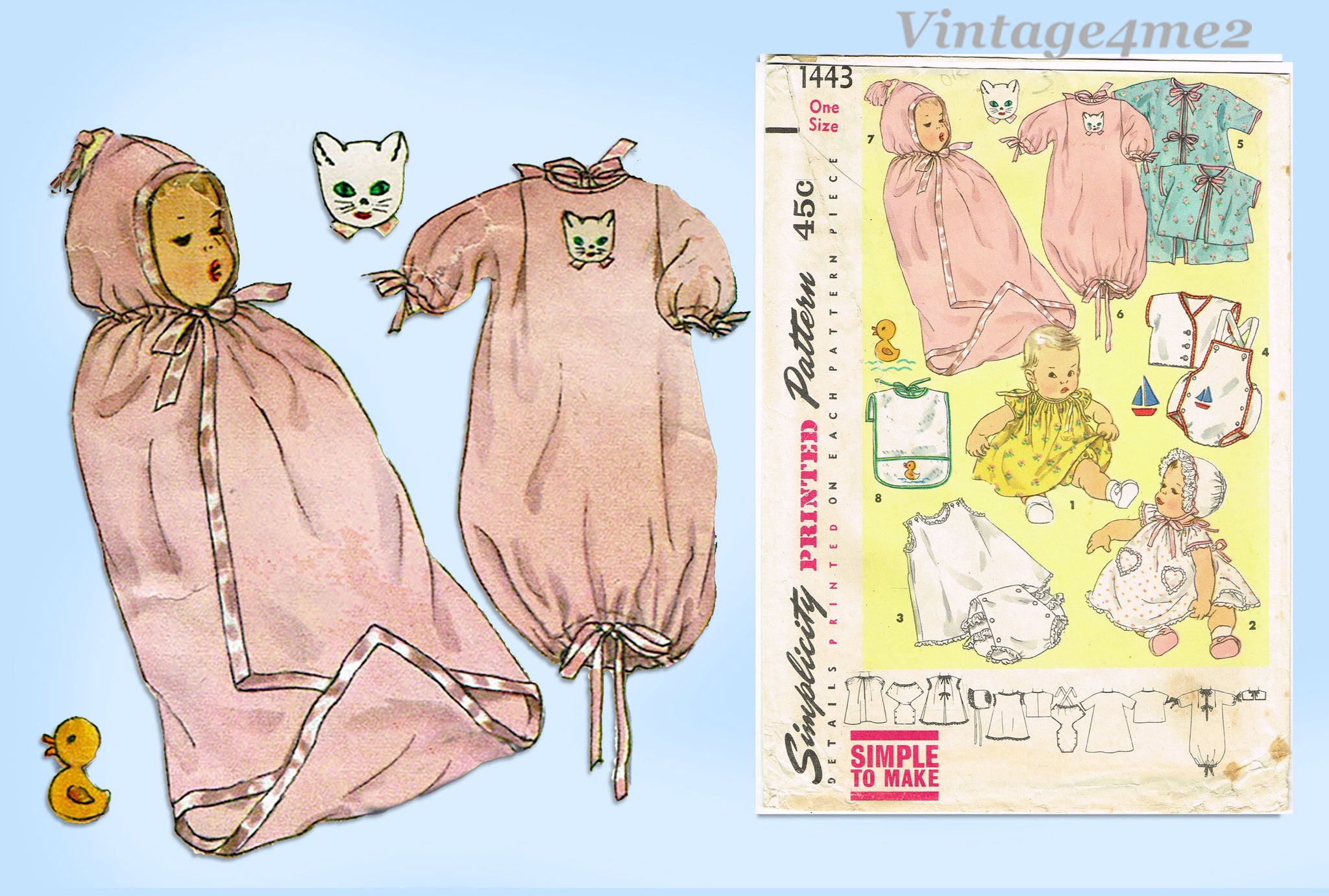 1950s Vintage Simplicity Sewing Pattern 1443 Uncut Easy Infant Layette Set w Boat App
