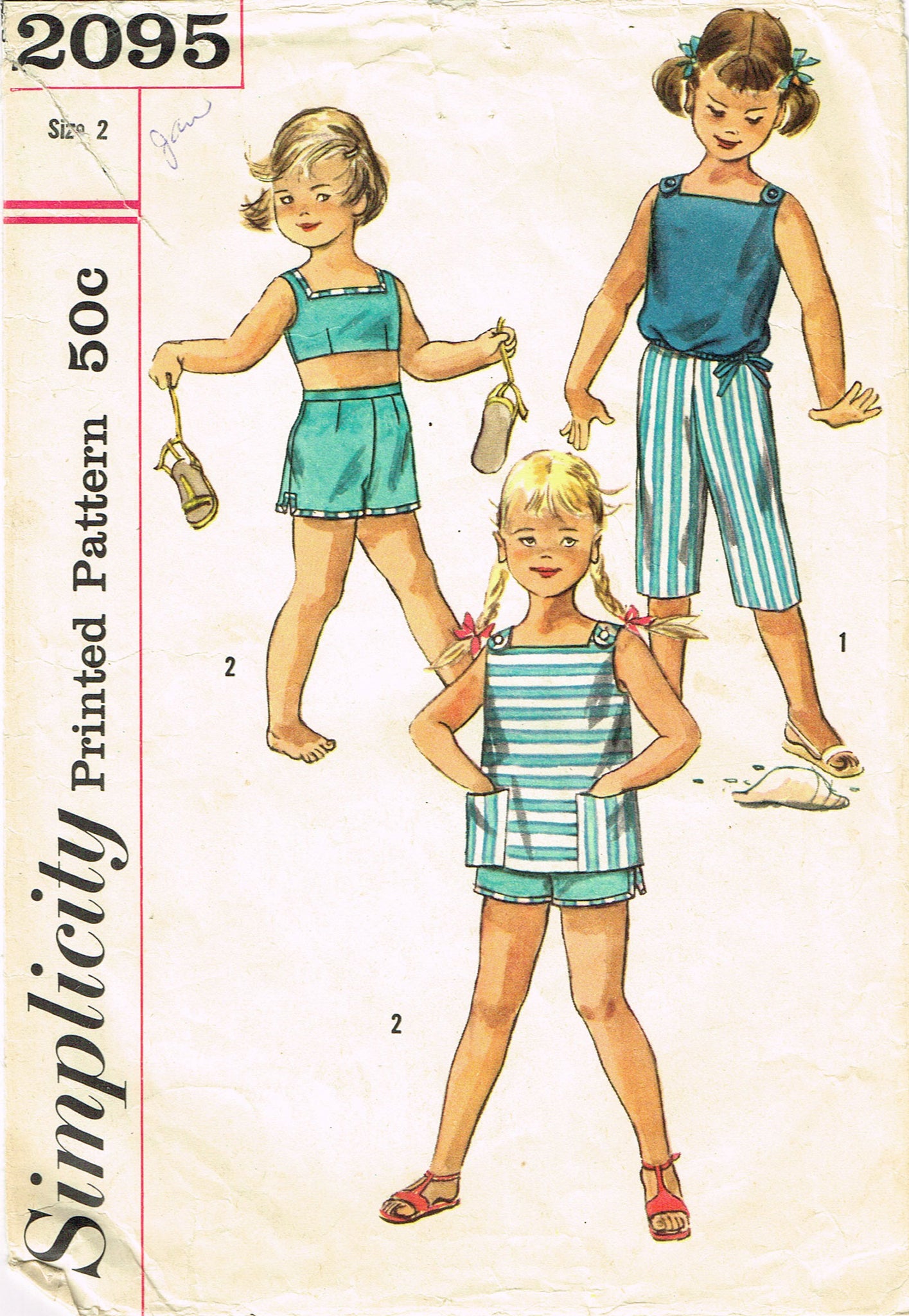 1950s Vintage Simplicity Sewing Pattern 2095 Toddler Girls Play Clothes Set Sz 2