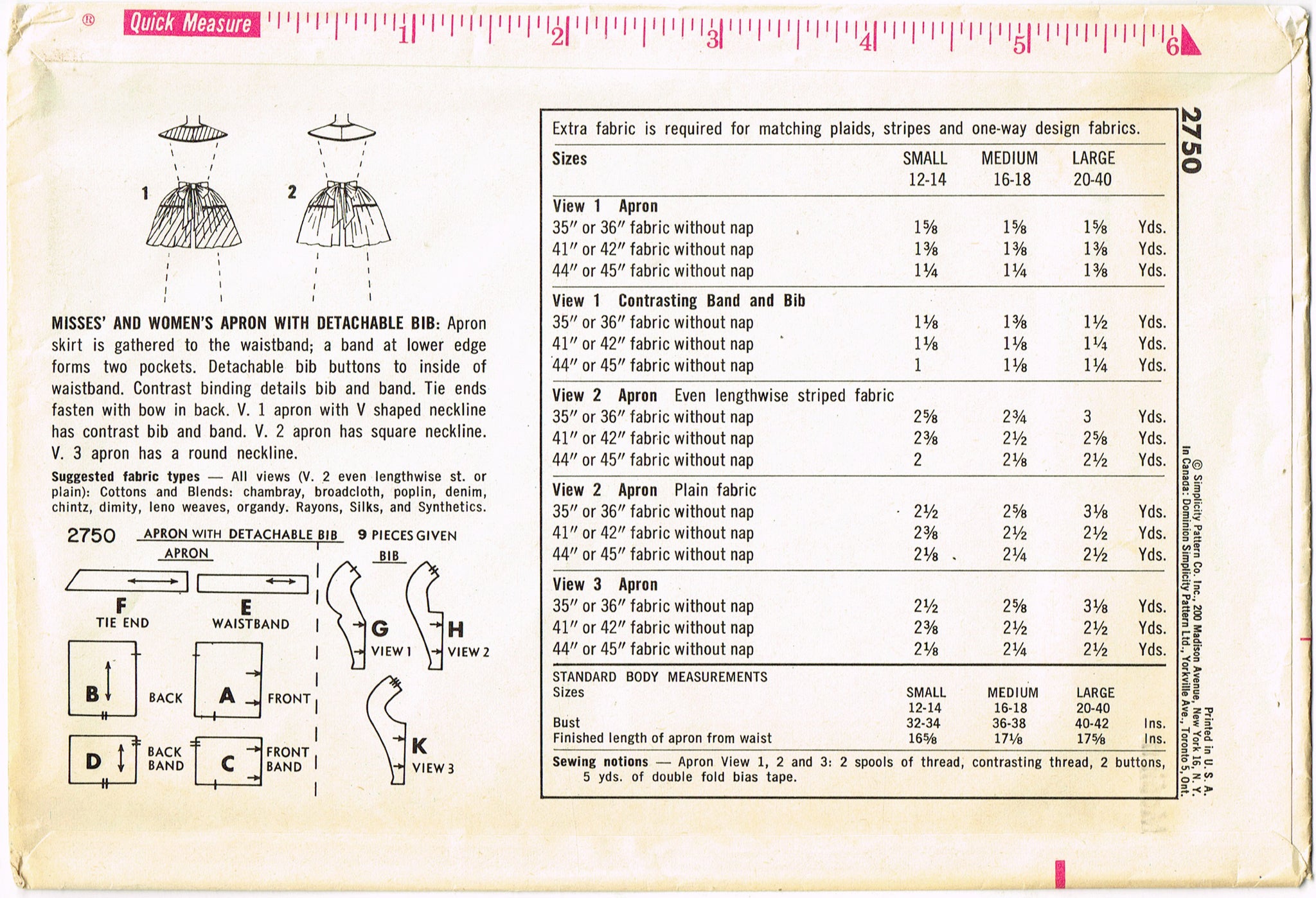 1950s Vintage Simplicity Sewing Pattern 2750 Uncut Misses Apron Size Medium