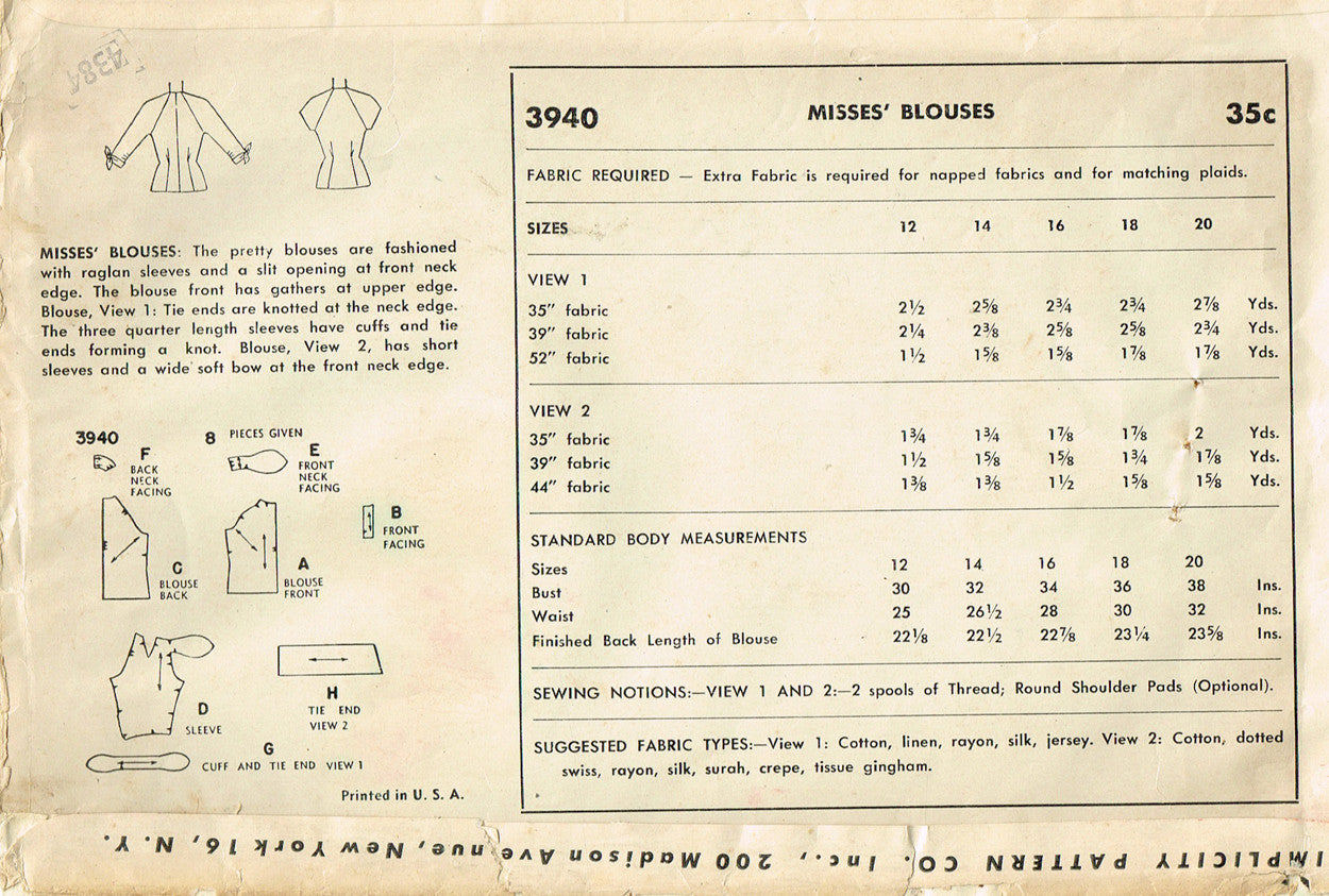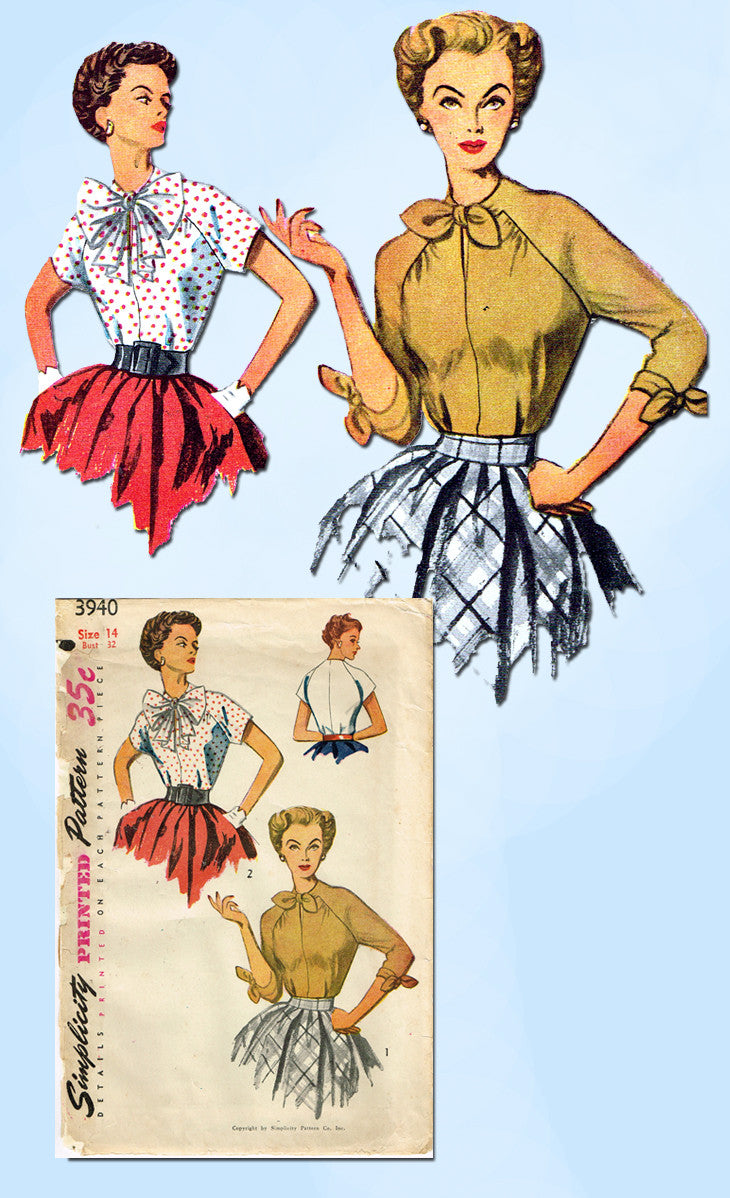 1950s Vintage Simplicity Sewing Pattern 3940 Misses Tied Raglan Blouse 32B