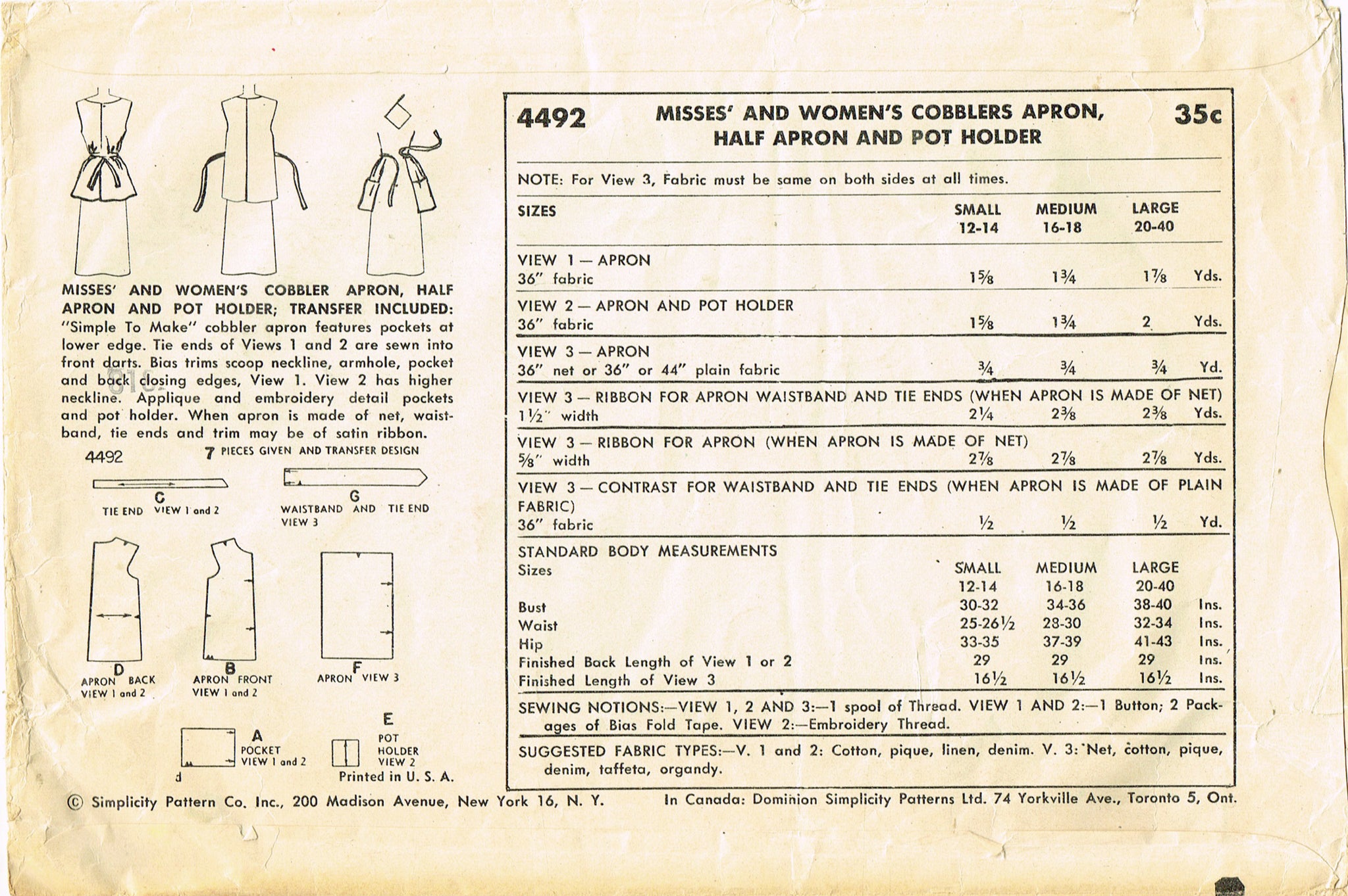 1950s Vintage Simplicity Sewing Pattern 4492 Simple Misses Cobbler Apron Sz MED