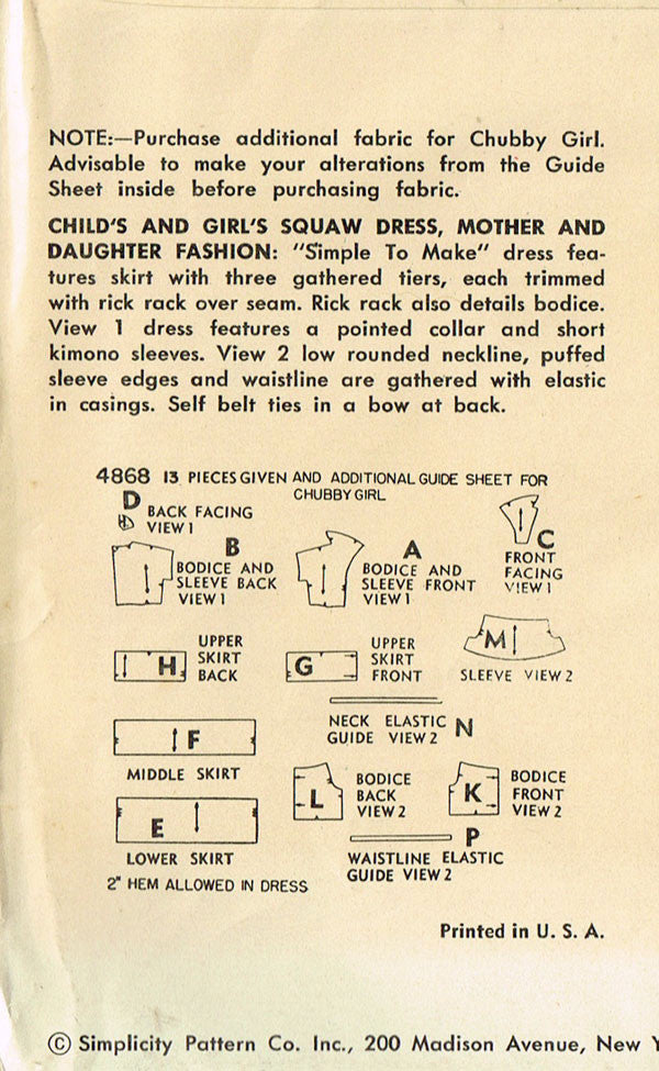 1950s Vintage Simplicity Sewing Pattern 4868 FF Toddler Girl's Squaw Dress Sz 4