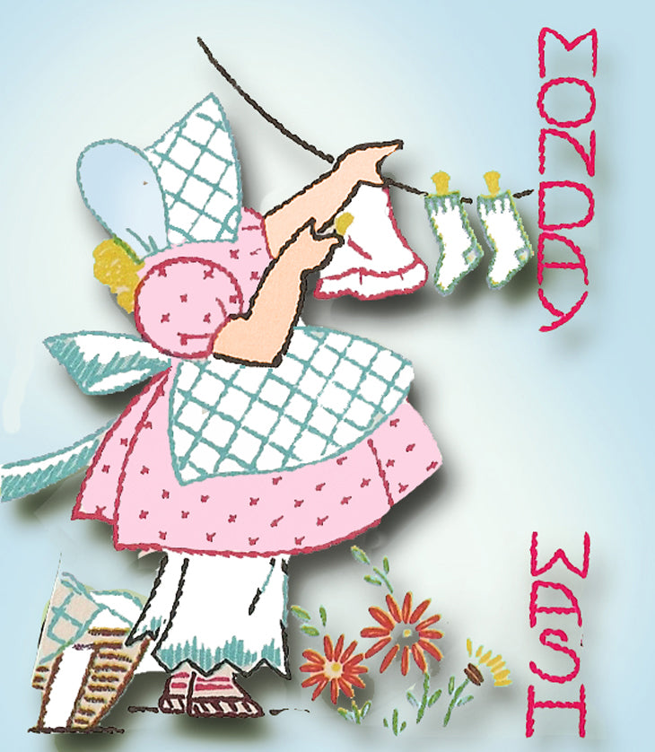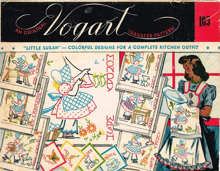 This is a very cute transfer from Vogart in the 1950s. This transfer has a classic sunbonnet sue in a chore a day or day of the week format. There are 7 motifs for a Monday through Sunday set of dish towels. There are also cute motifs to trim aprons and make potholders. It is factory folded and unused and comes in the original worn 1950s envelope with black top band.