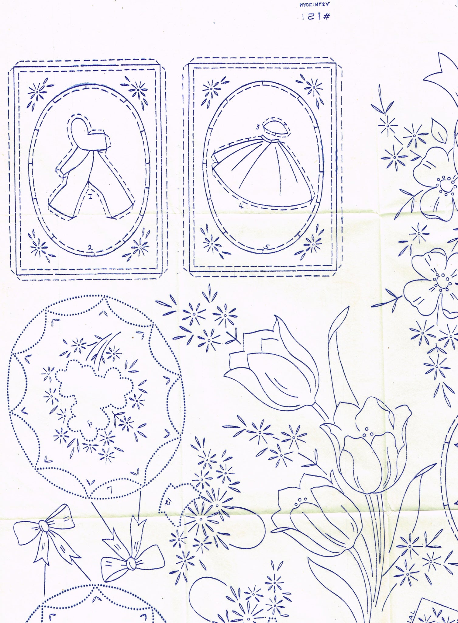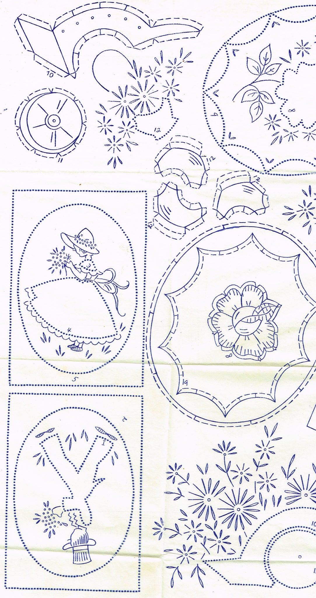 This is a very cute transfer from Vogart in the 1950s. This transfer has a wonderful set of floral designs with touches of applique. It is factory folded and unused and comes in the original 1950s envelope with black top band.