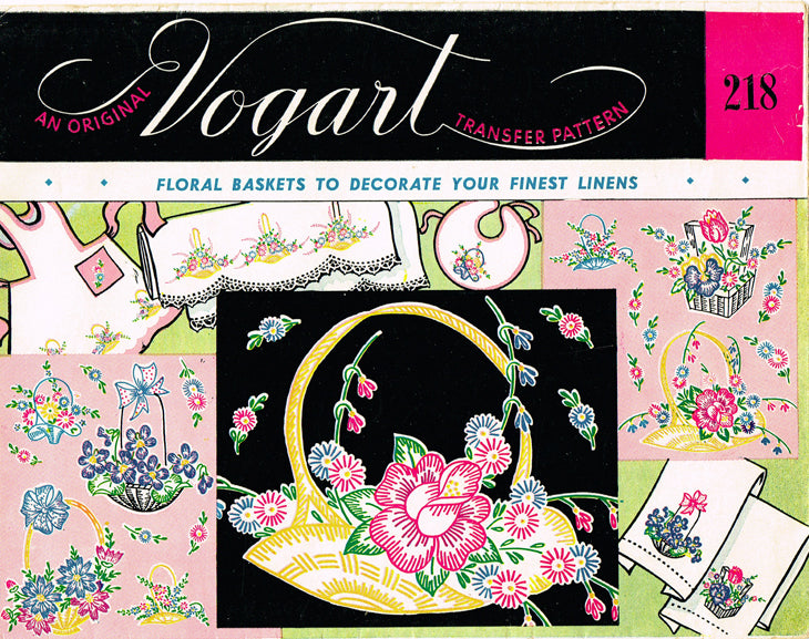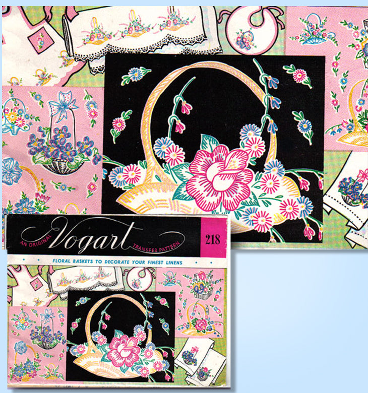 This is a wonderful vintage transfer. It is Vogart 218. This transfer has flower baskets in different shapes and sizes that you can use all over your house. Pillowcases, vanity scarves, runners, table cloths, napkins and hand towels all look great with flower basket trims. This is undated but I am guessing 1950s from the style of the transfer and envelope. It comes to you uncut, unused and factory folded and includes the envelope. There are real sweeties and the pic says it all.