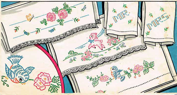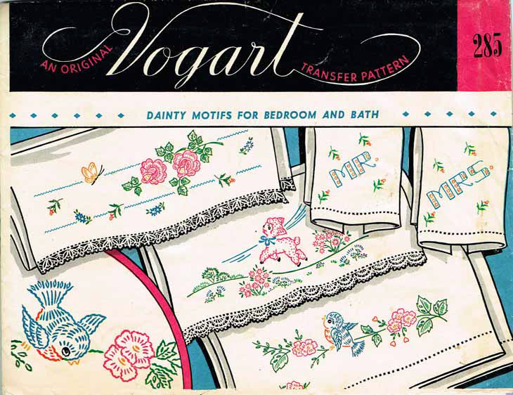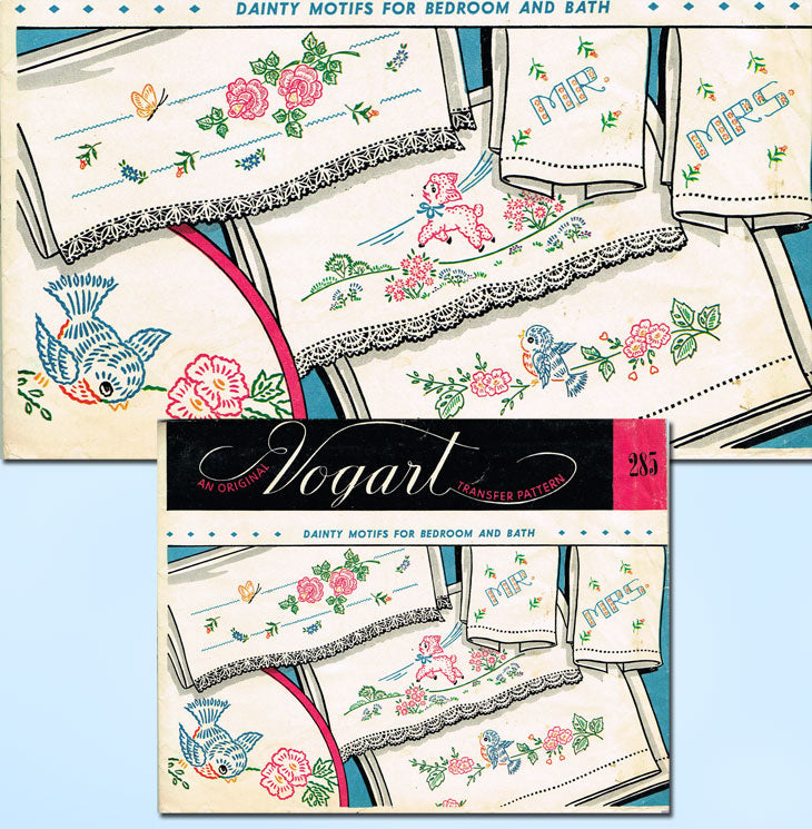 This is a sweetie of a vintage transfer. It is Vogart 285. This charmer has a lamb for counting sheep, a classic bluebird design and Mr and Mrs motifs for pillowcase ends. This is undated but I am guessing 1950s from the style of the transfer and envelope. It comes to you uncut, unused in the original envelope. There are real sweeties and the pic says it all.