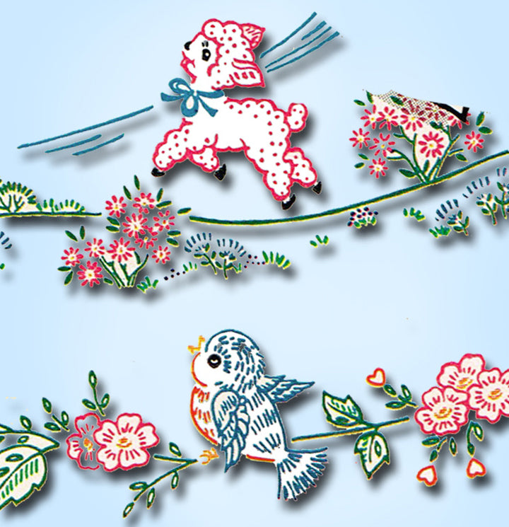 1950s Vintage Vogart Embroidery Transfer 285 Lamb Flowers Bluebird Pillowcases