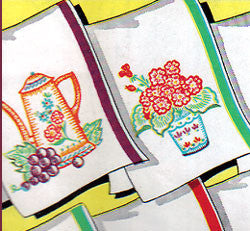 This is a sweetie of an uncut vintage transfer. This is a Vogart 679. This transfer is from the 1950s. It is a set for the whole kitchen with tea towels, potholders, apron and napkins.