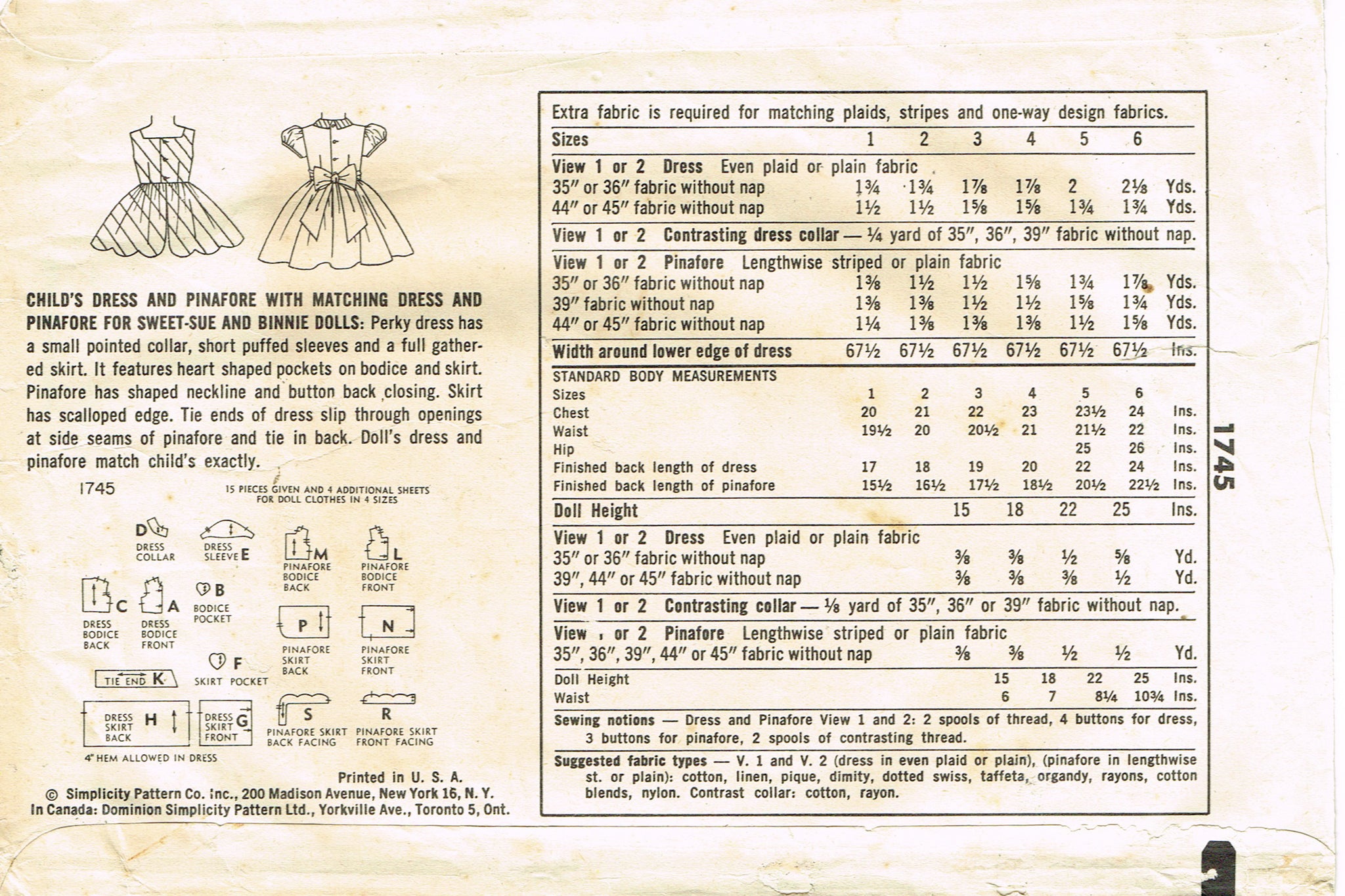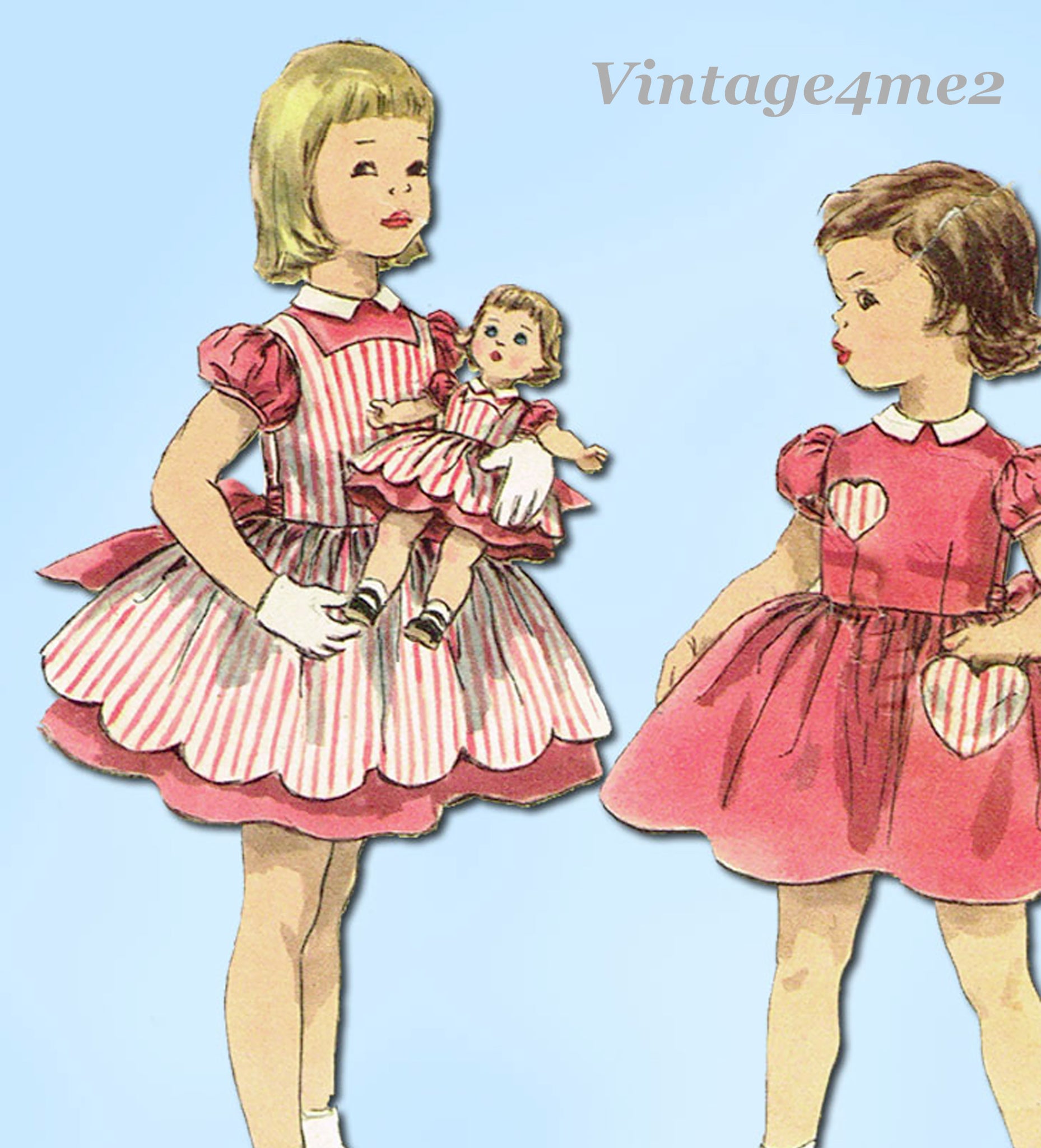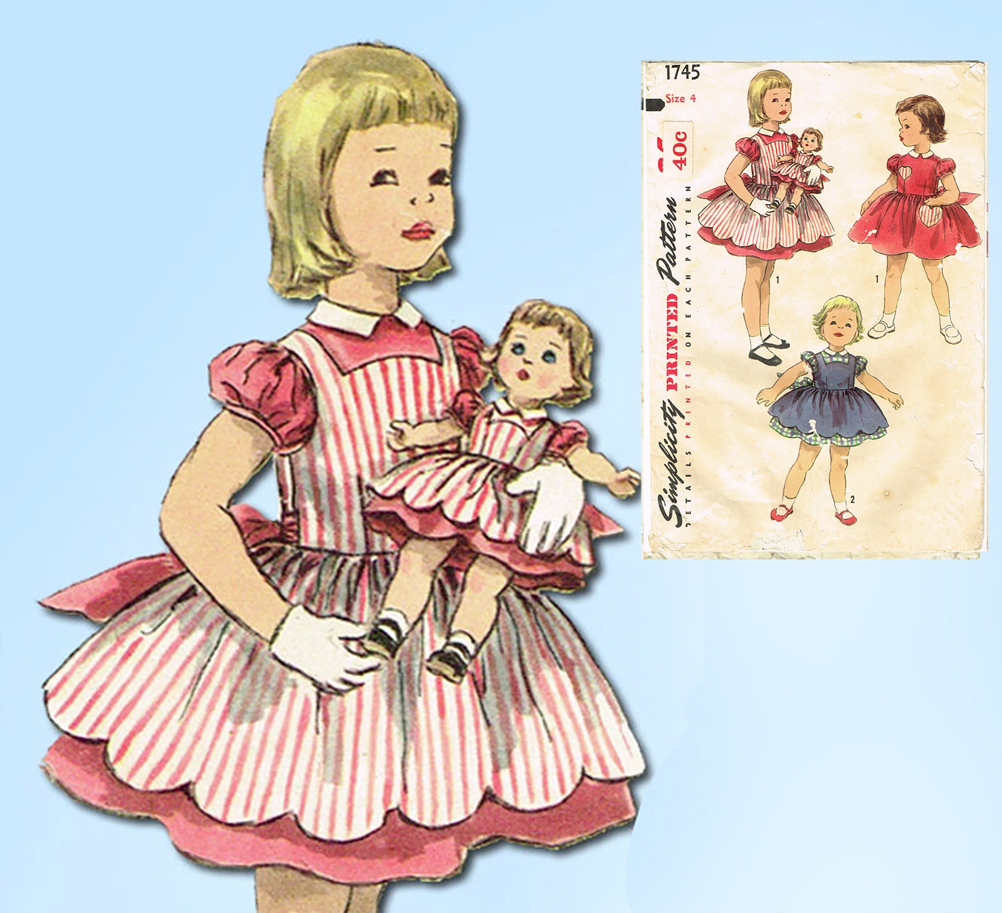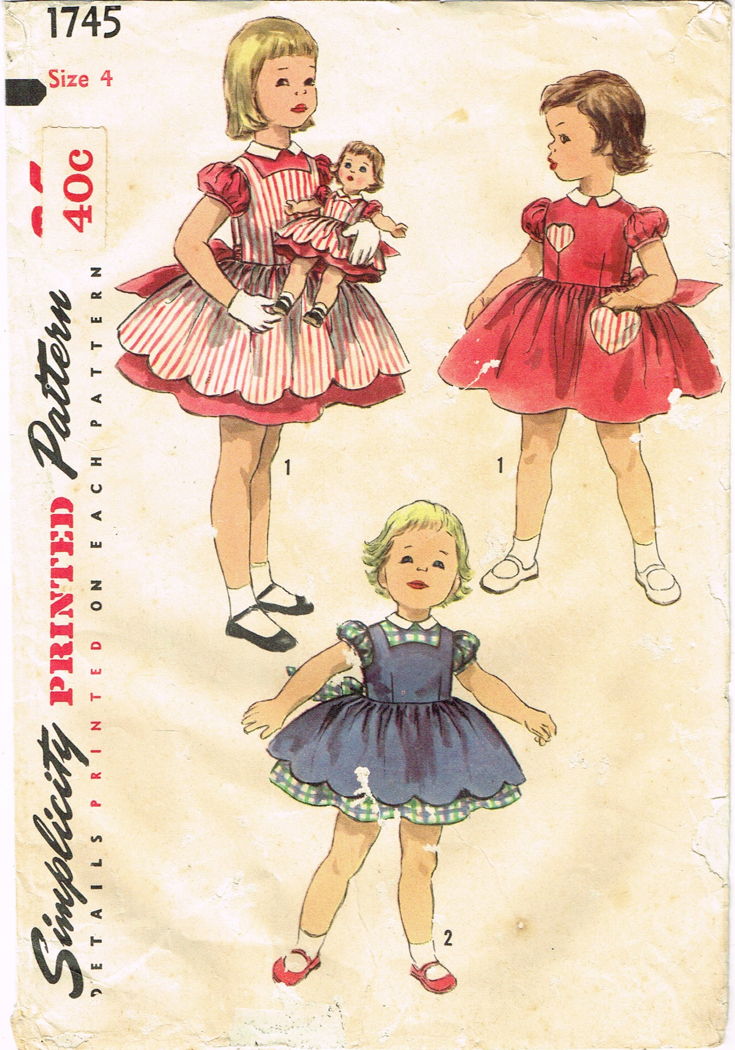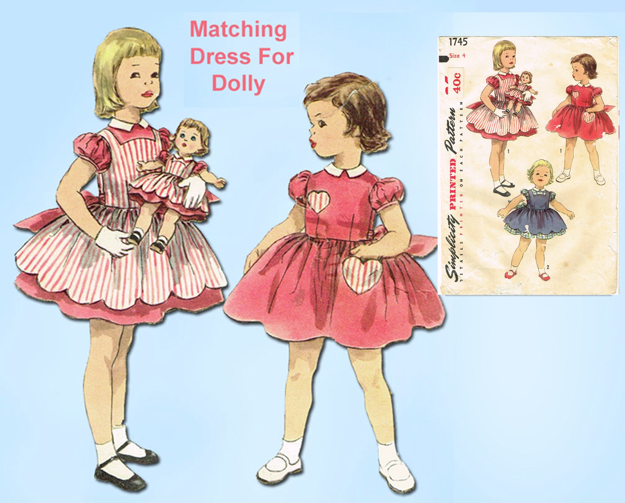 1950s VTG Simplicity Sewing Pattern 1745 Toddler Girls Dress Matching Doll Sz 4