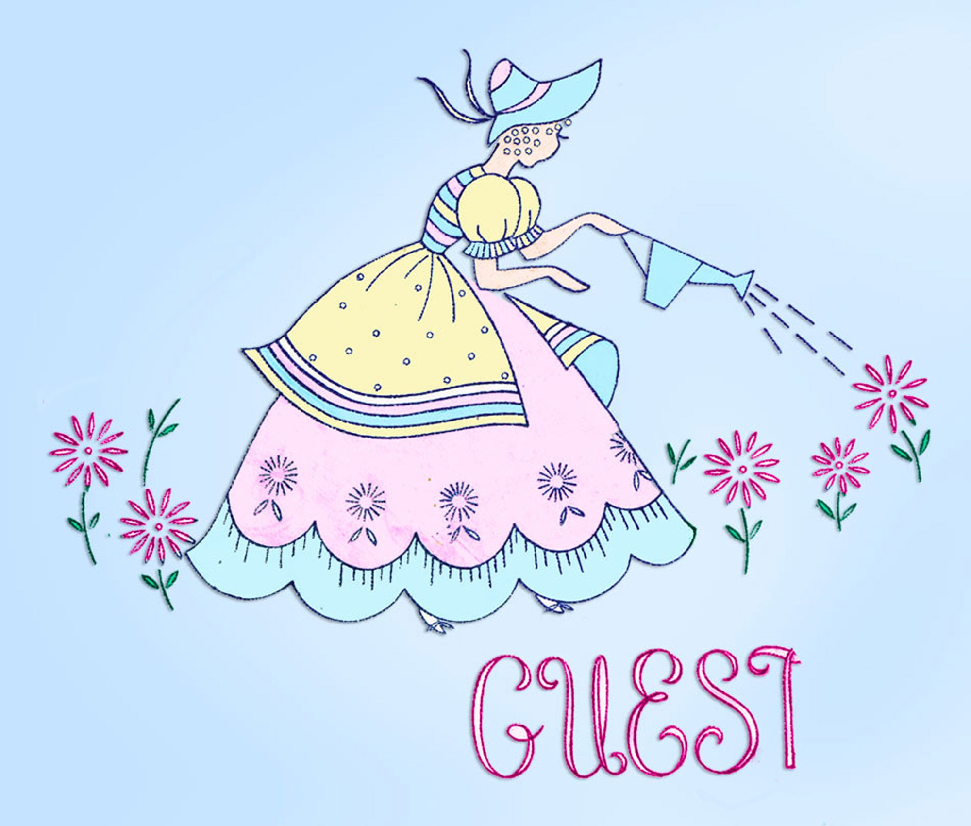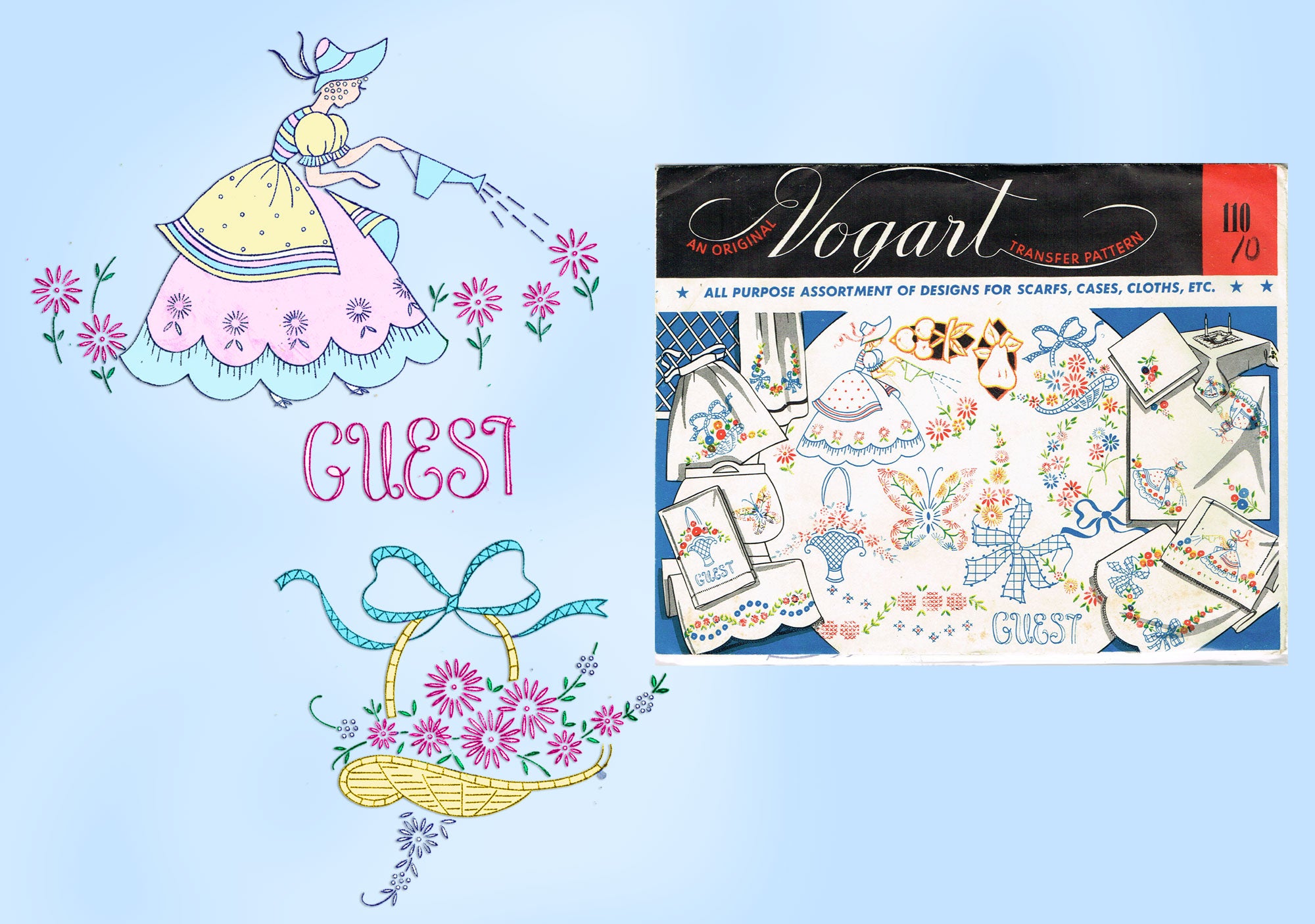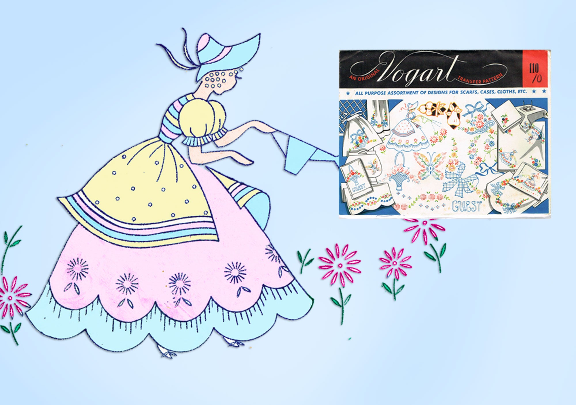 1950s VTG Vogart Embroidery Transfer 110 Uncut Garden Girl & More Linen Motifs