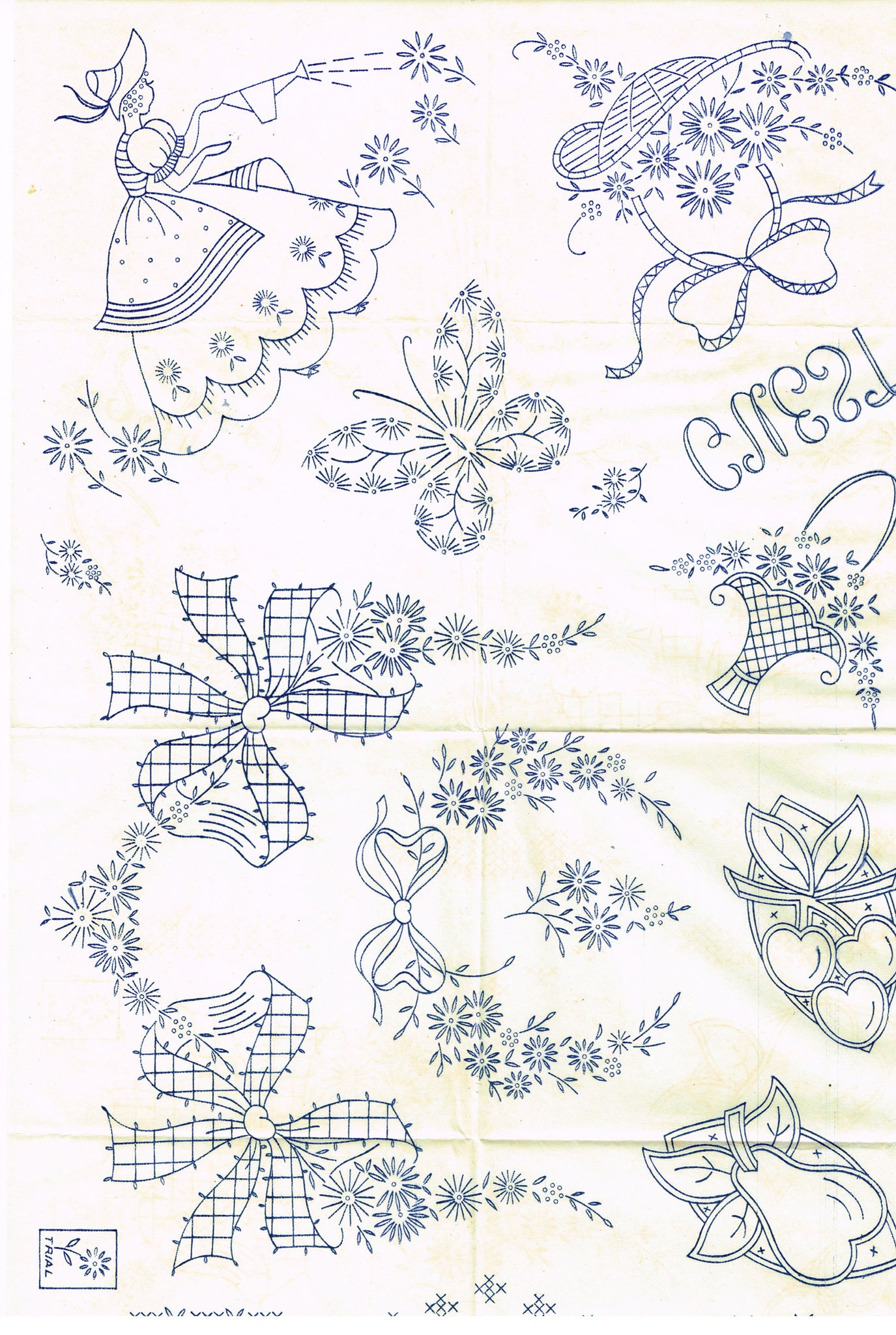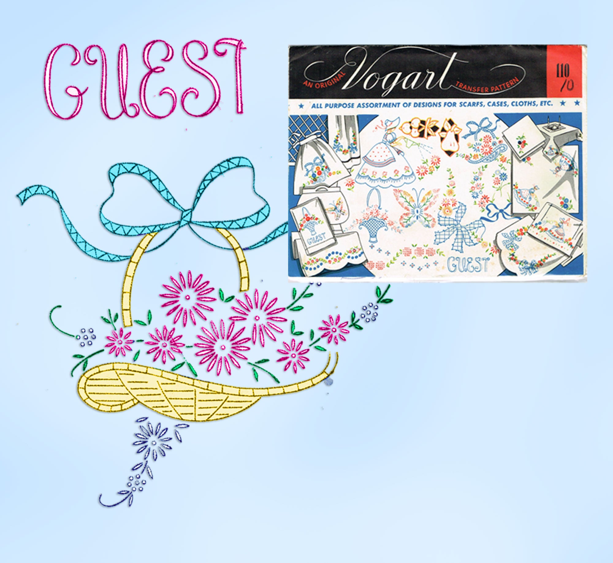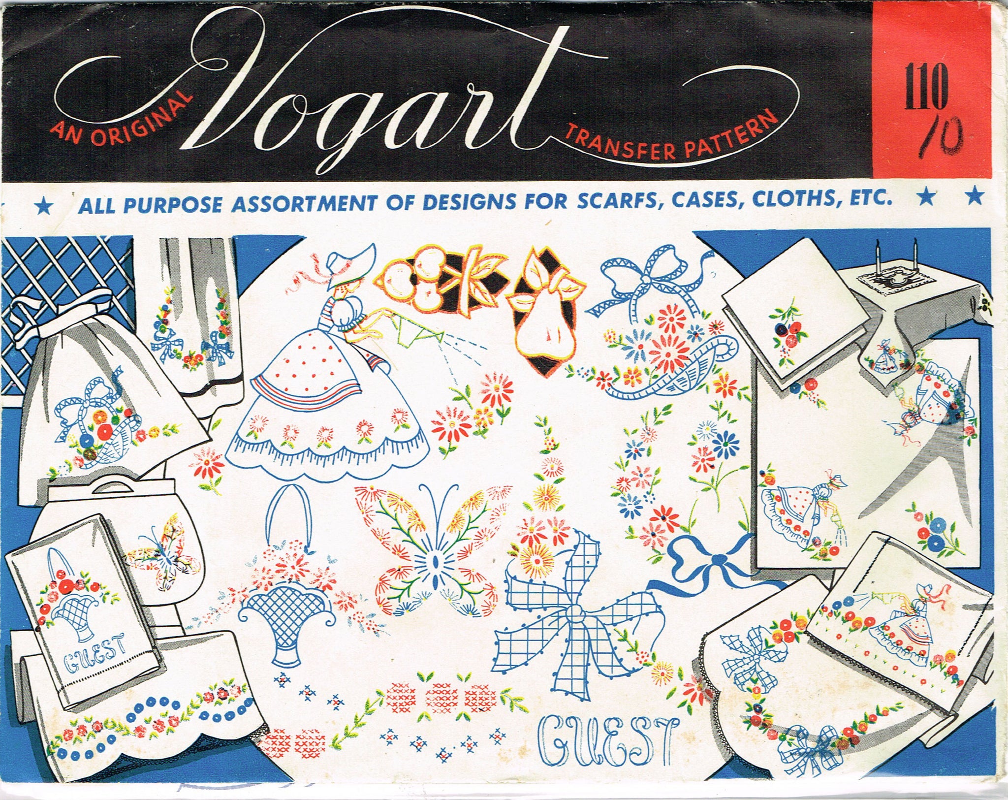 This is a wonderful vintage embroidery transfer from Vogart in the 1950s. This is a great set of mixed motifs, ideal for bedroom linens. I see a garden girl, flower basket, cutwork fruit, bows and butterflies. They are meant for pillowcases, scarves, towels or sheets. It is in very nice condition and comes with the original envelope.