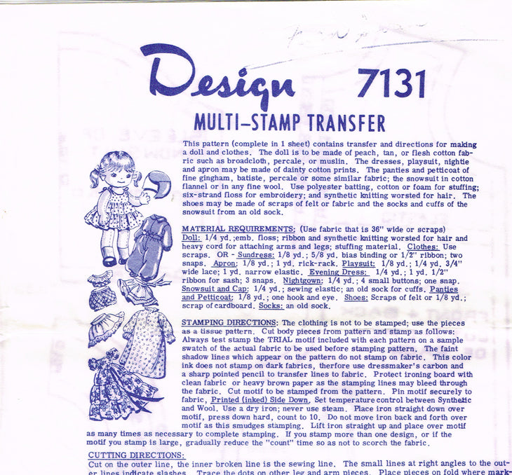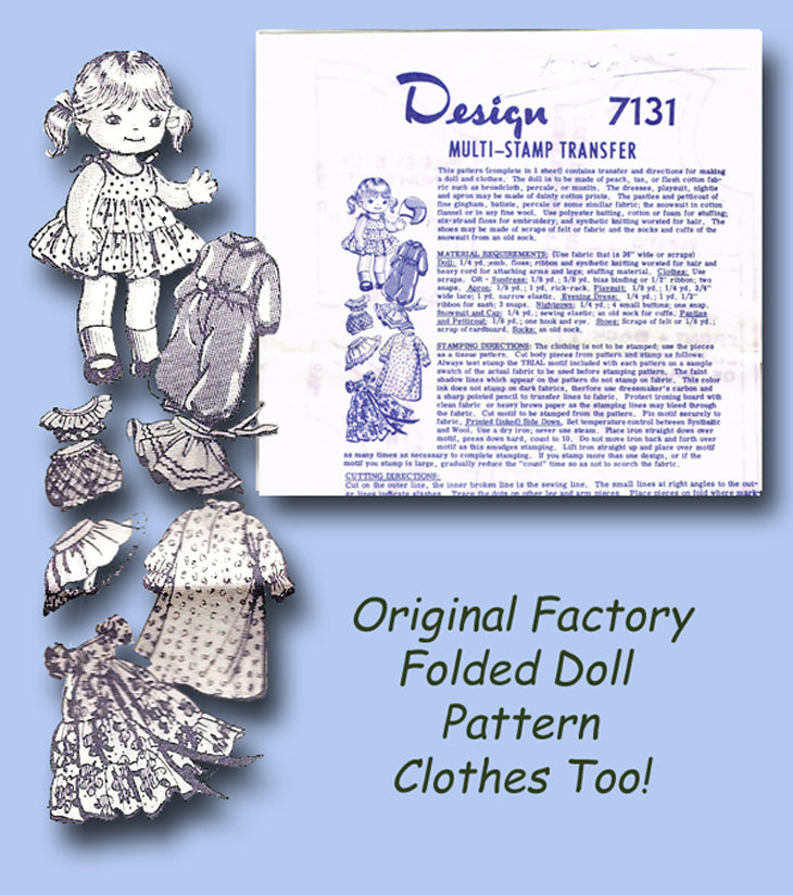1960s Original Vintage Mail Order Sewing Pattern 7131 Uncut Sock Doll w Wardrobe