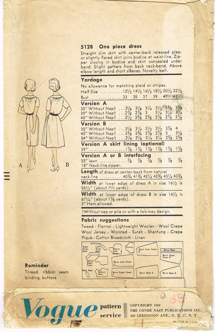 1960s Original Vintage Vogue Pattern 5128 Ladies Plus Size Day Dress Size 41 B