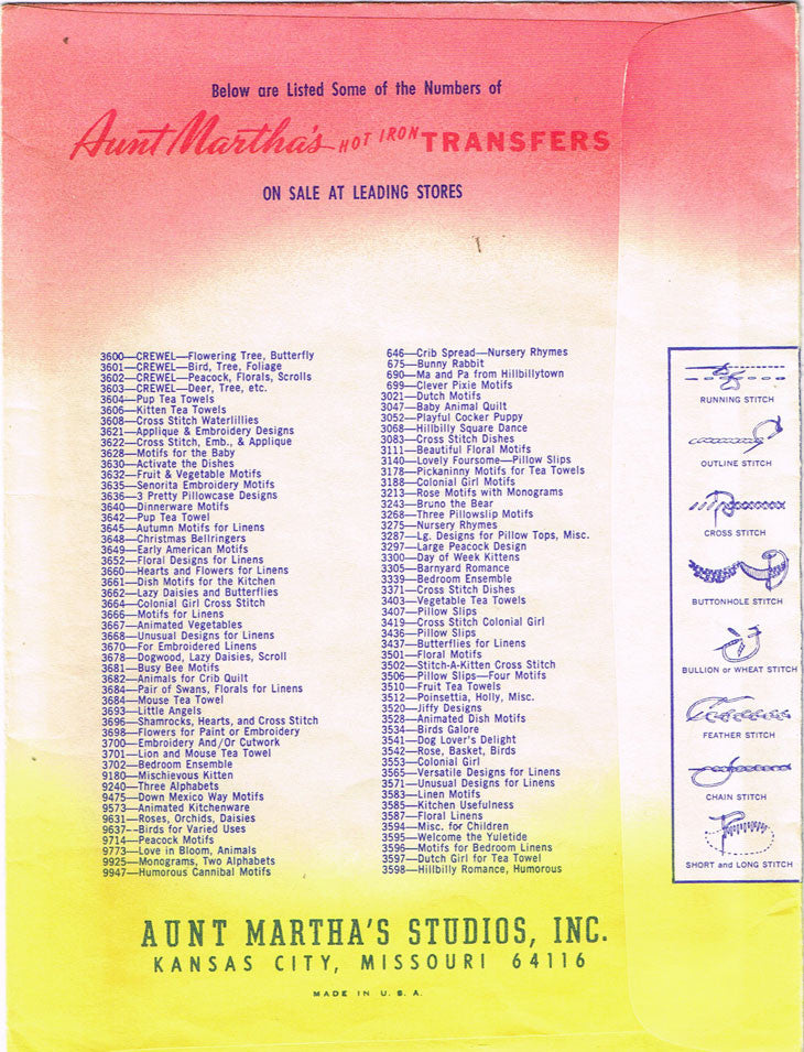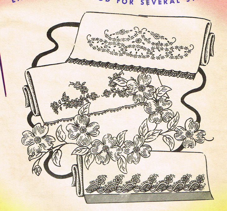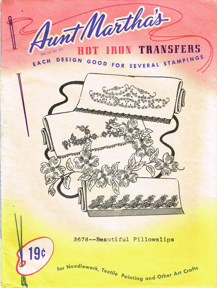 This is a charming vintage transfer. I am sure this is Aunt Martha's 3678 dated after 1962. This is uncut, unused and still factory folded. Included are darling designs for the best bed linen and towel ends. I see four lovely floral arrangements perfectly sized for your pillowcase ends.