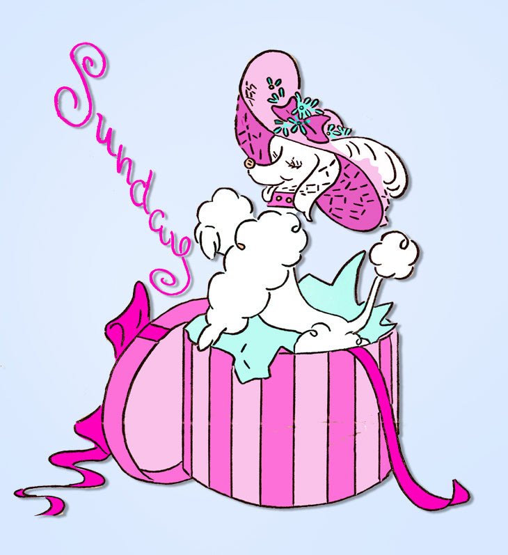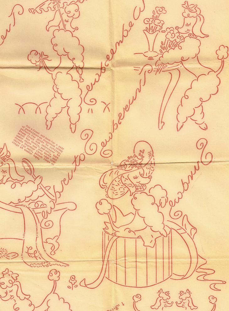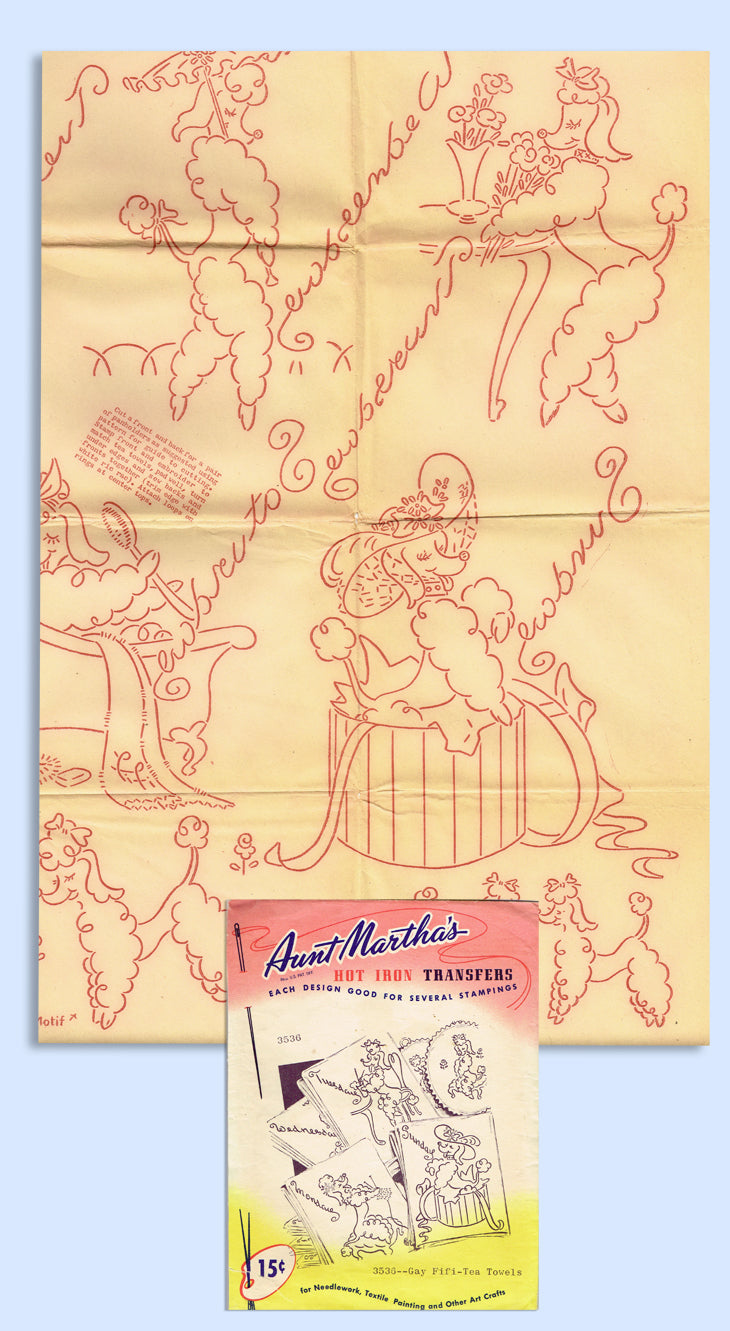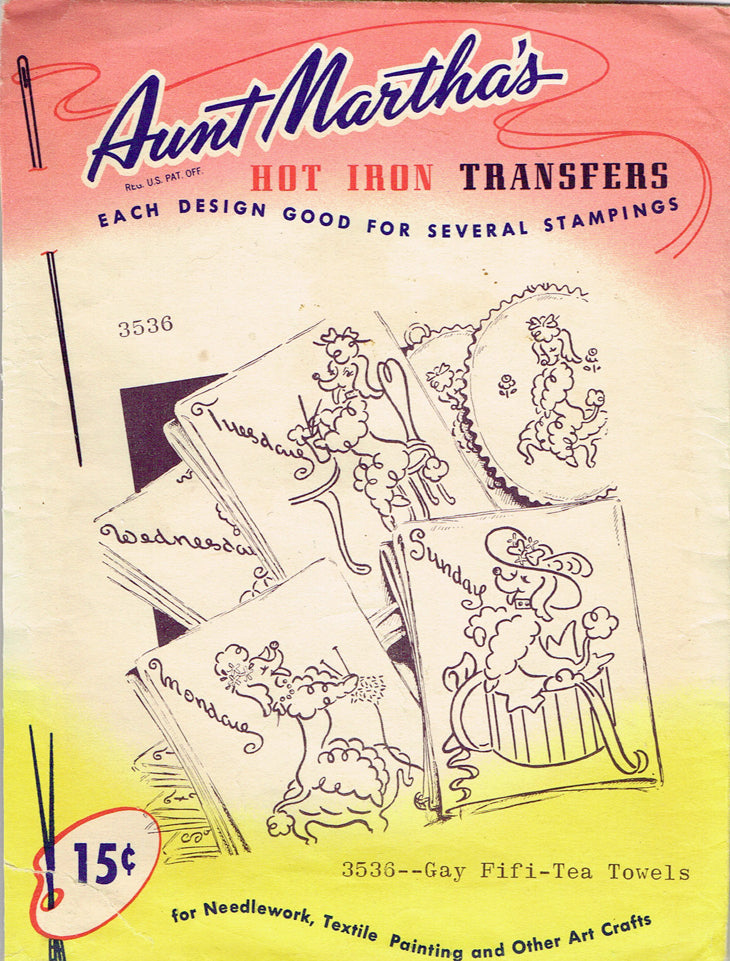This is a very cute transfer from Aunt Martha's the 1960s. This transfer makes a cute set of Day of the Week tea towels with a very fancy poodle named fifi.