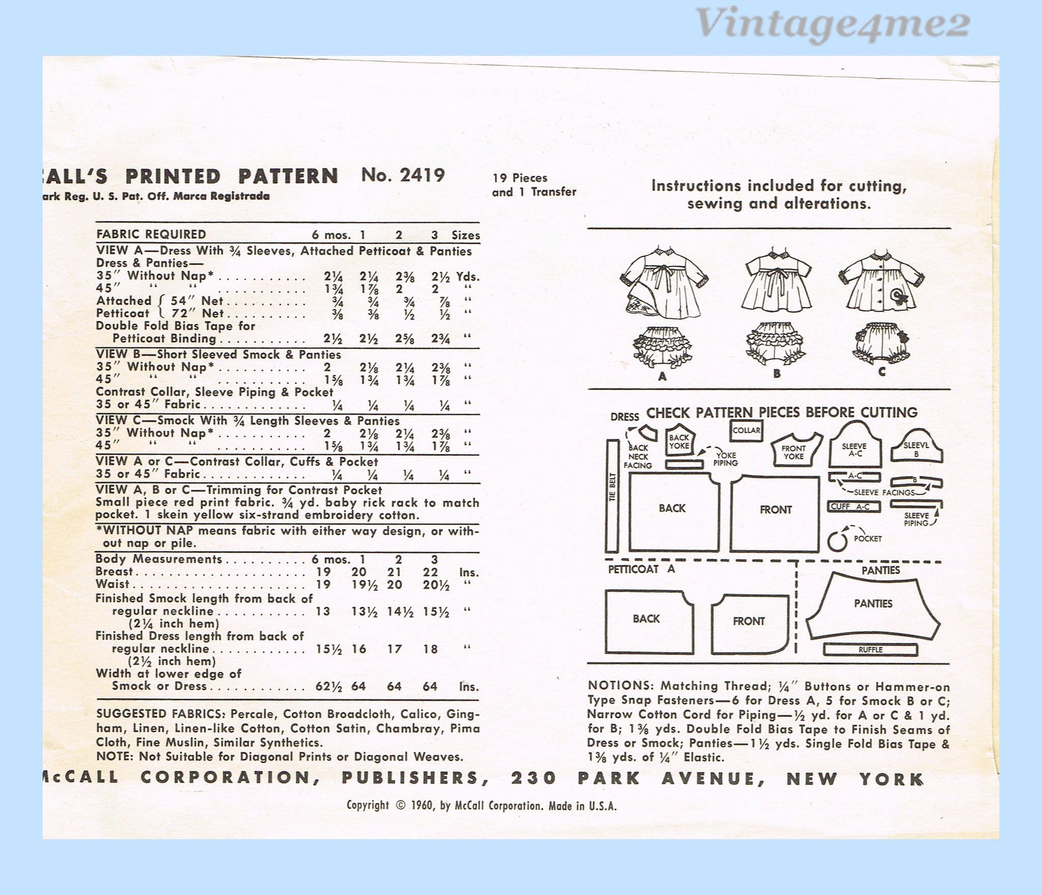 1960s Vintage McCalls Sewing Pattern 2419 Cute Helen Lee Baby Bloomer Dress Sz 1