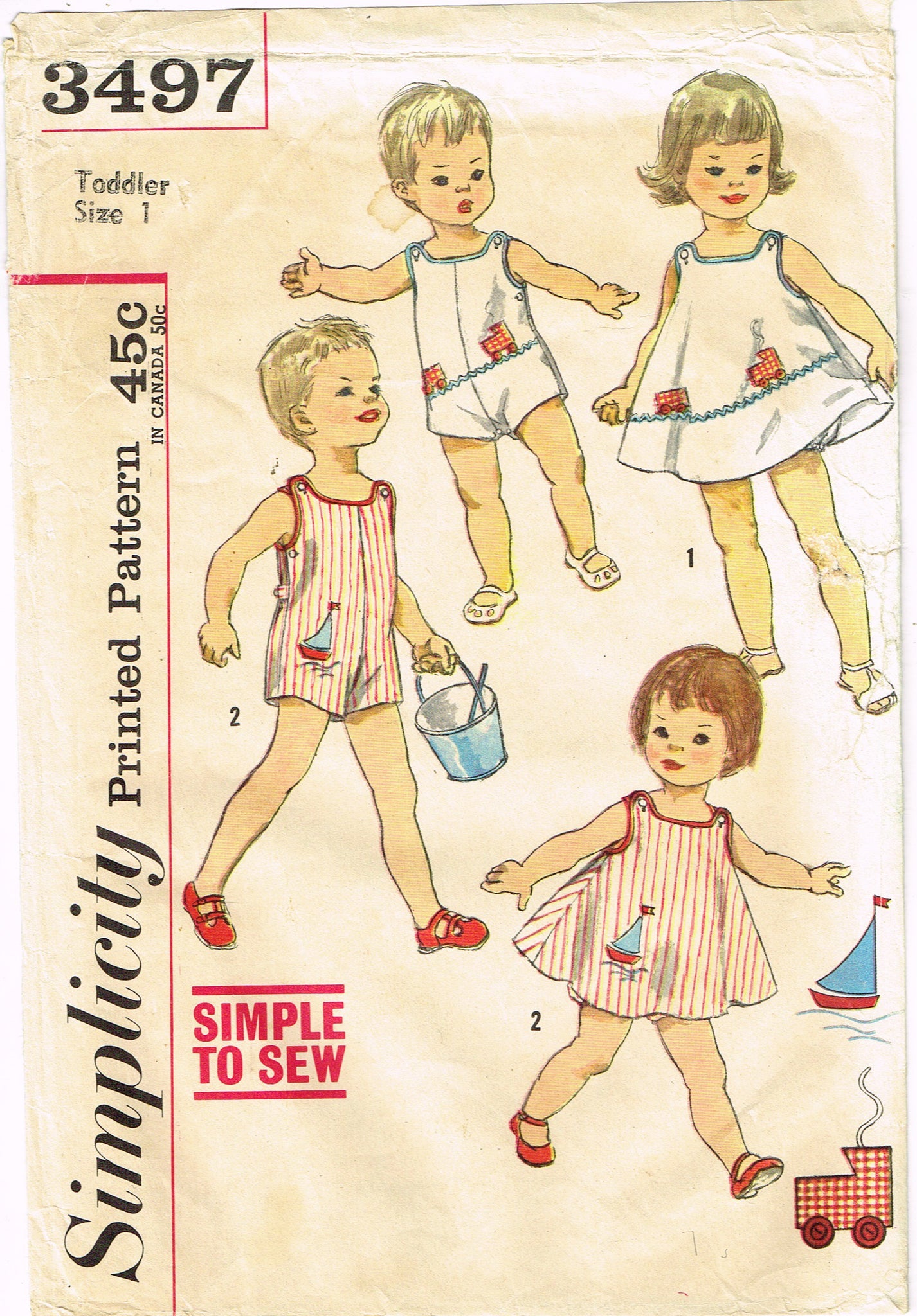 1960s Vintage Simplicity Sewing Pattern 3497 Baby Boys Girls Romper & Dress
