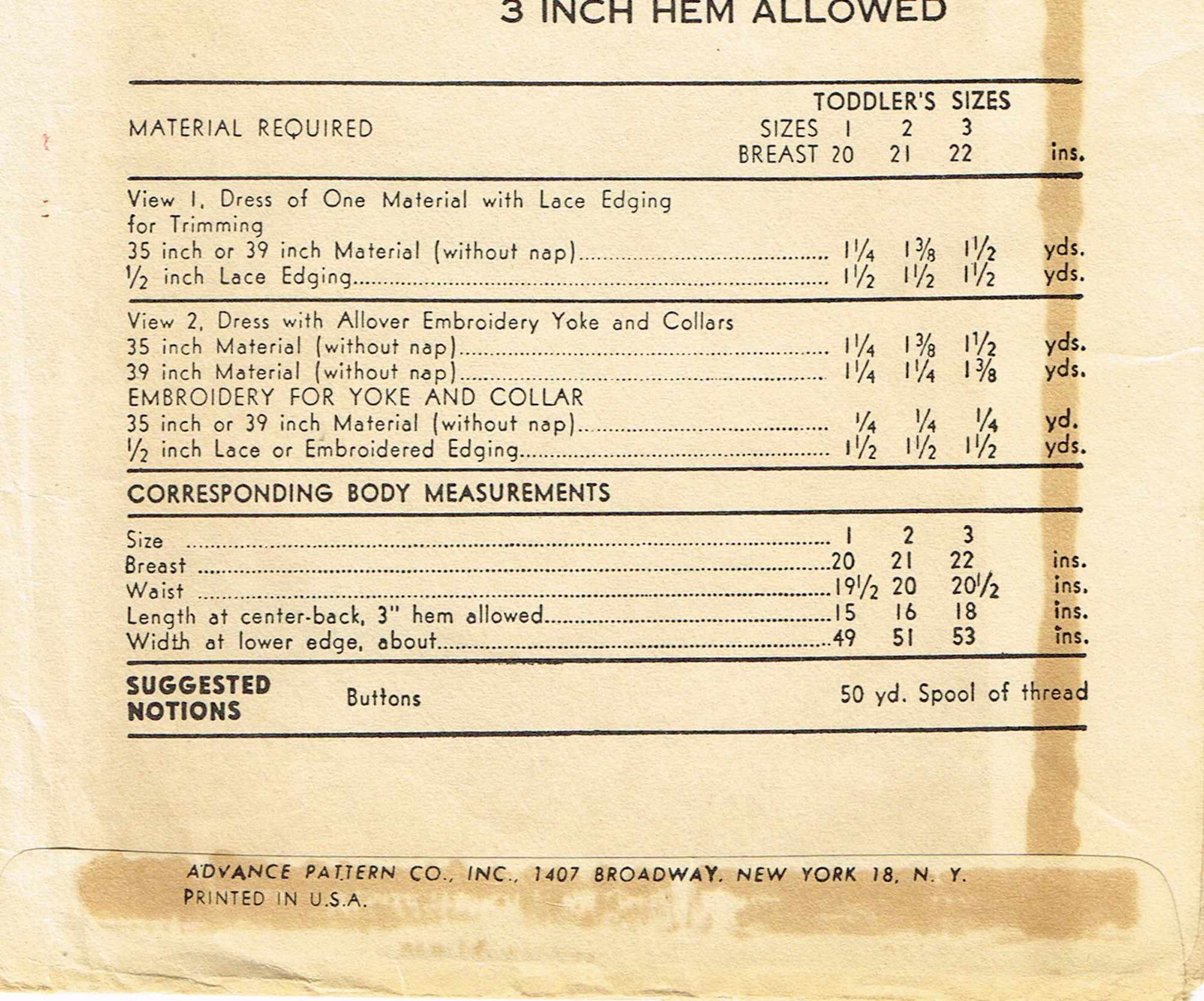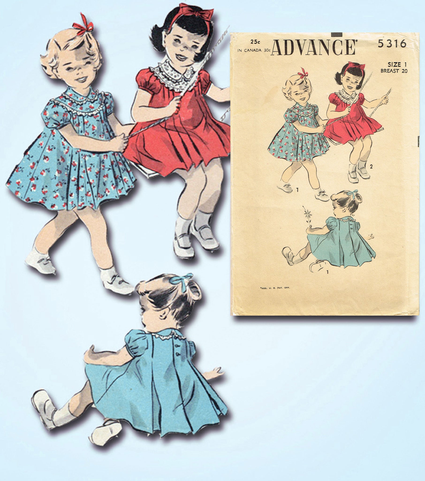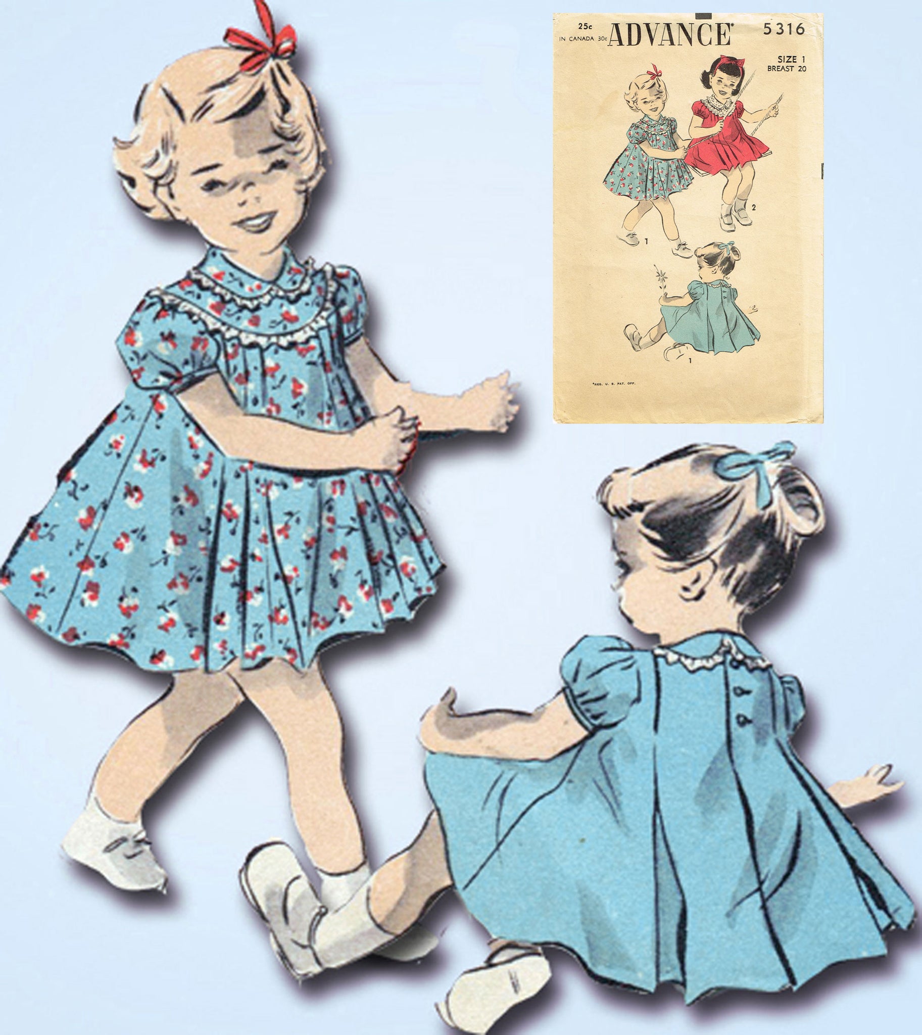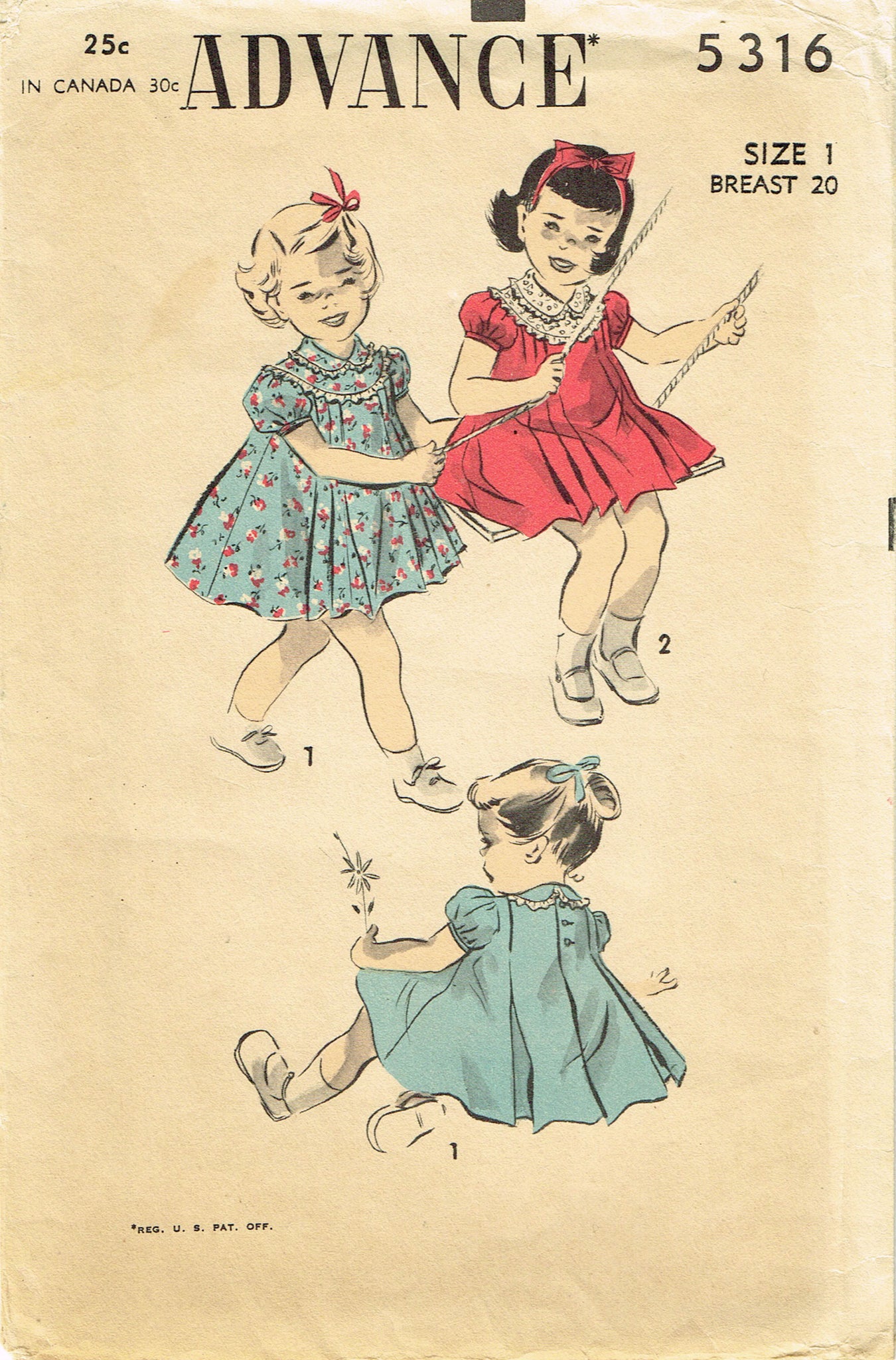 Advance 5316: 1940s Baby Girls Flared Pleated Dress Sz 1 Vintage Sewing Pattern