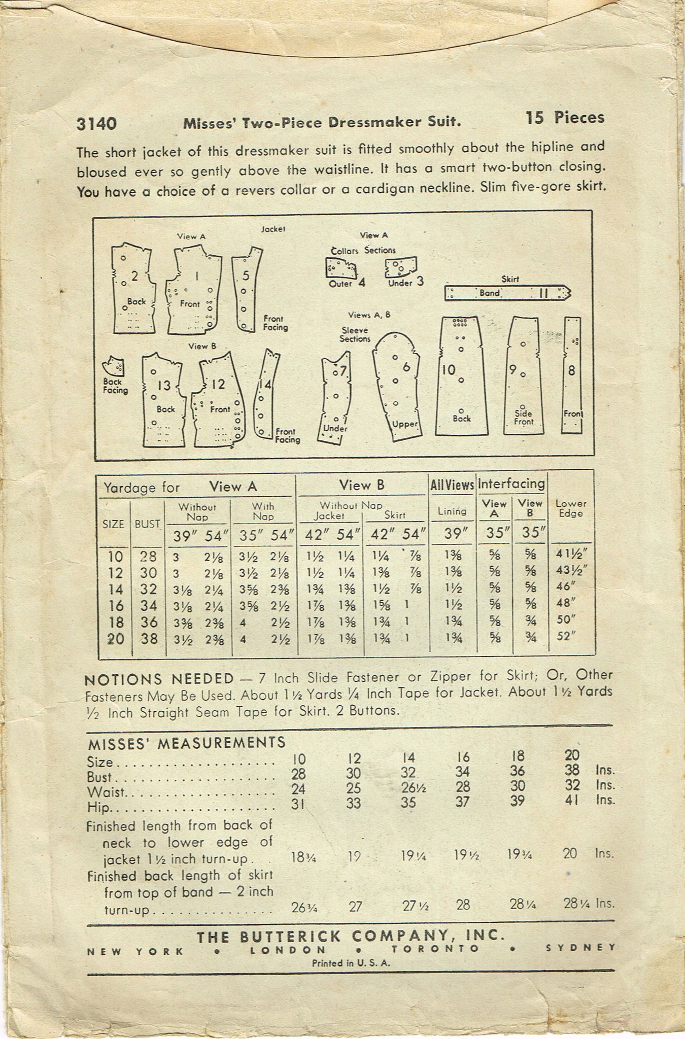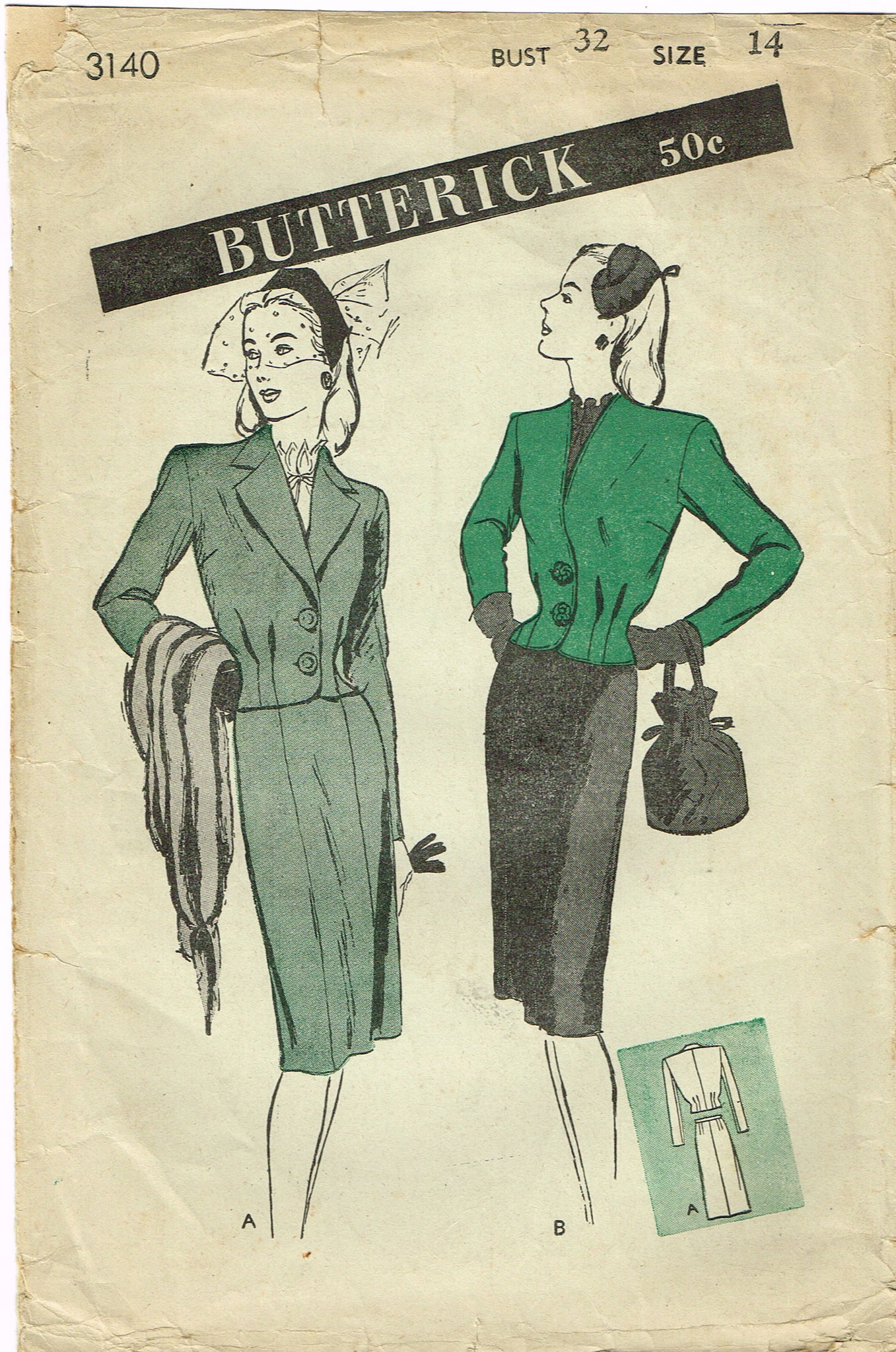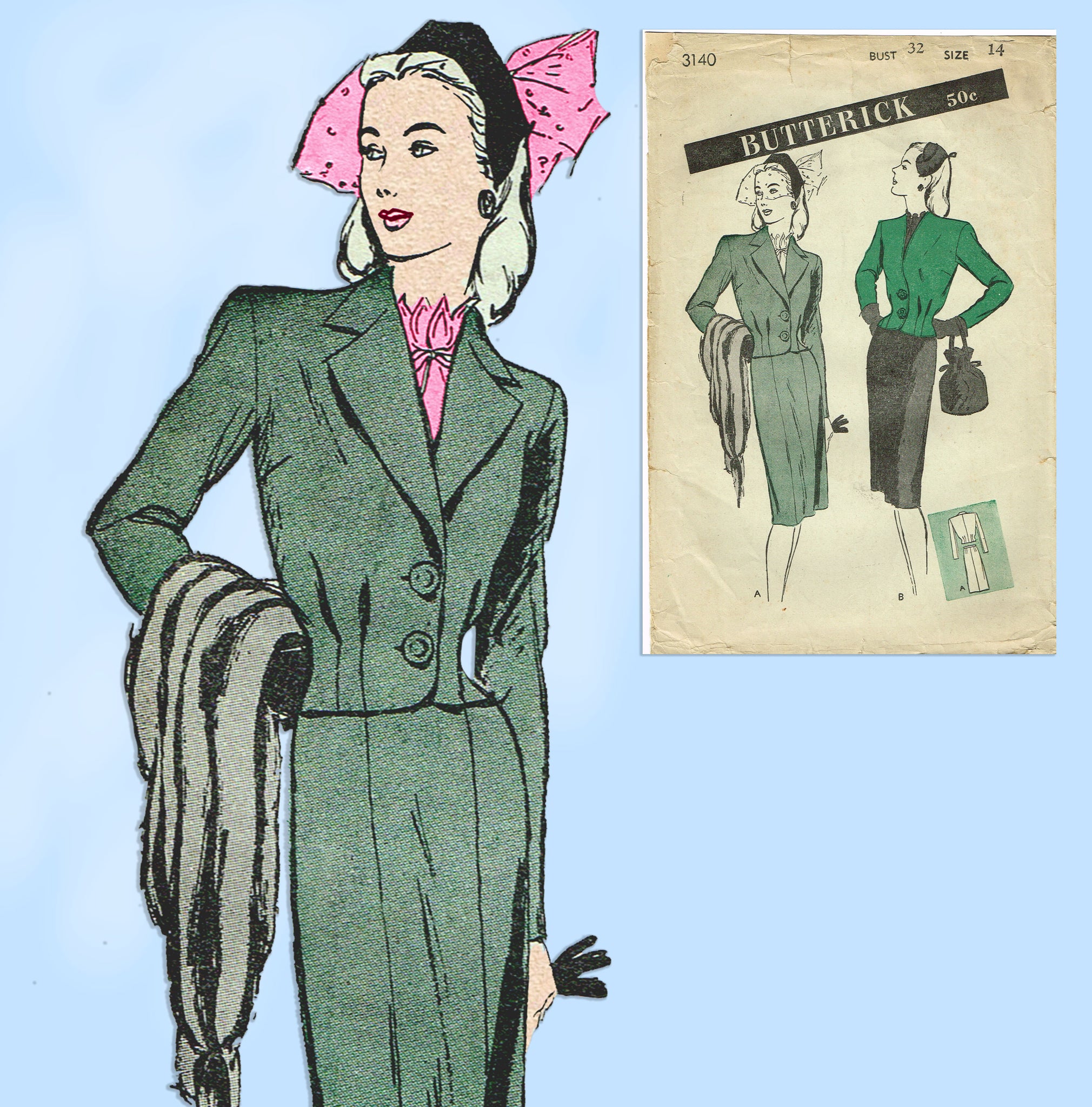 Butterick 3140: 1940s Misses WWII Dressmaker Suit Sz 32 B Vintage Sewing Pattern
