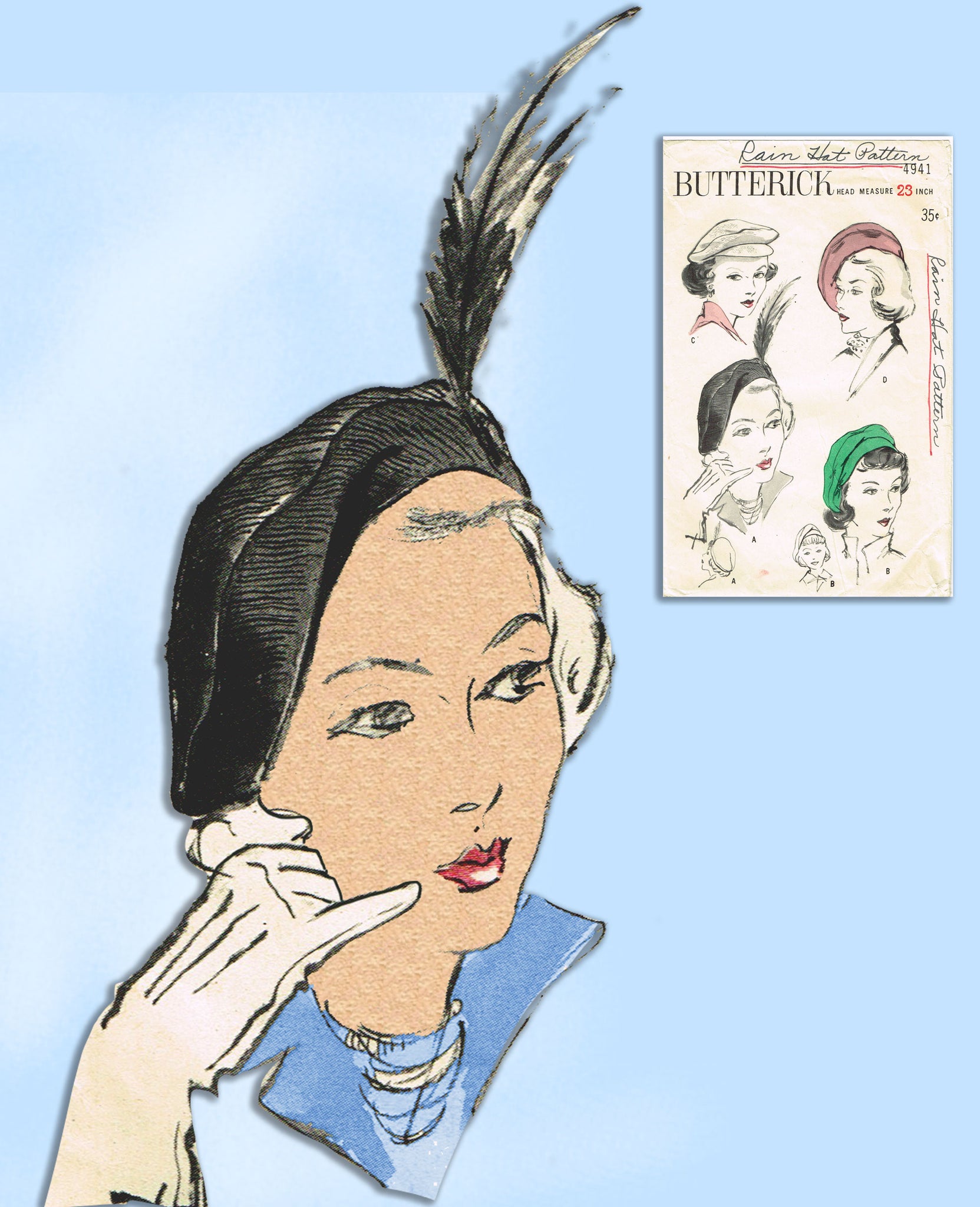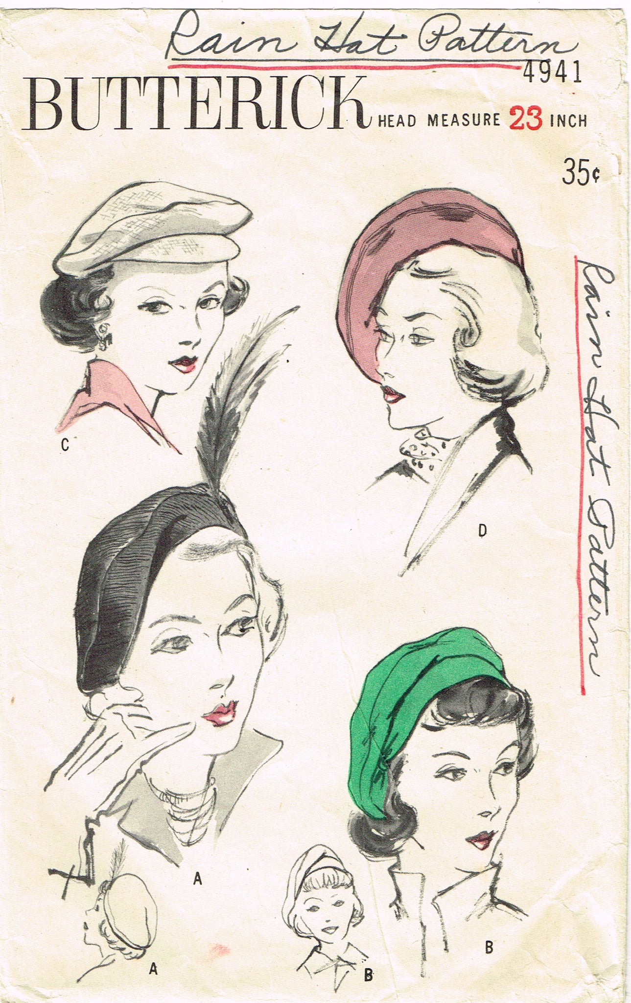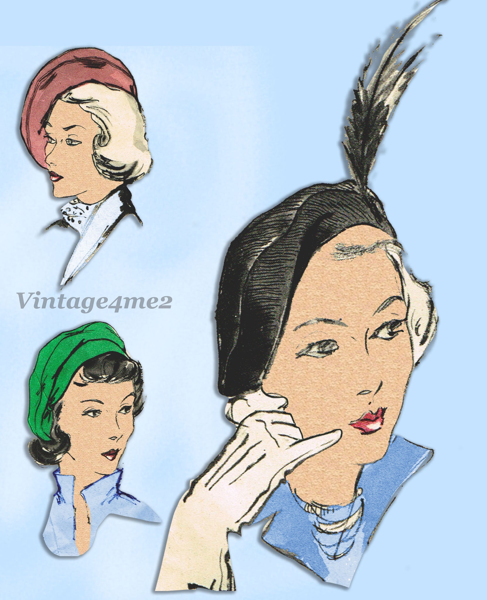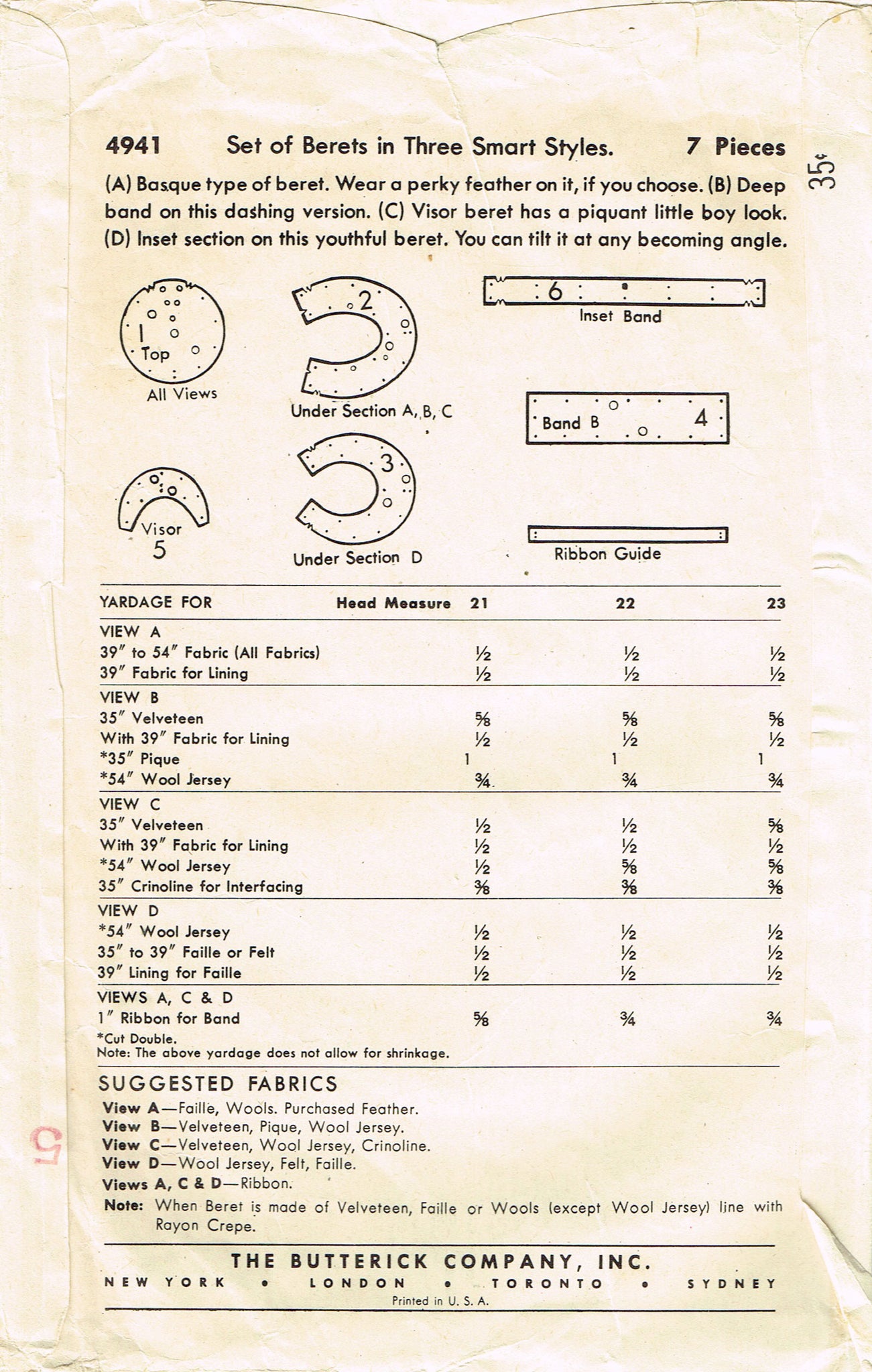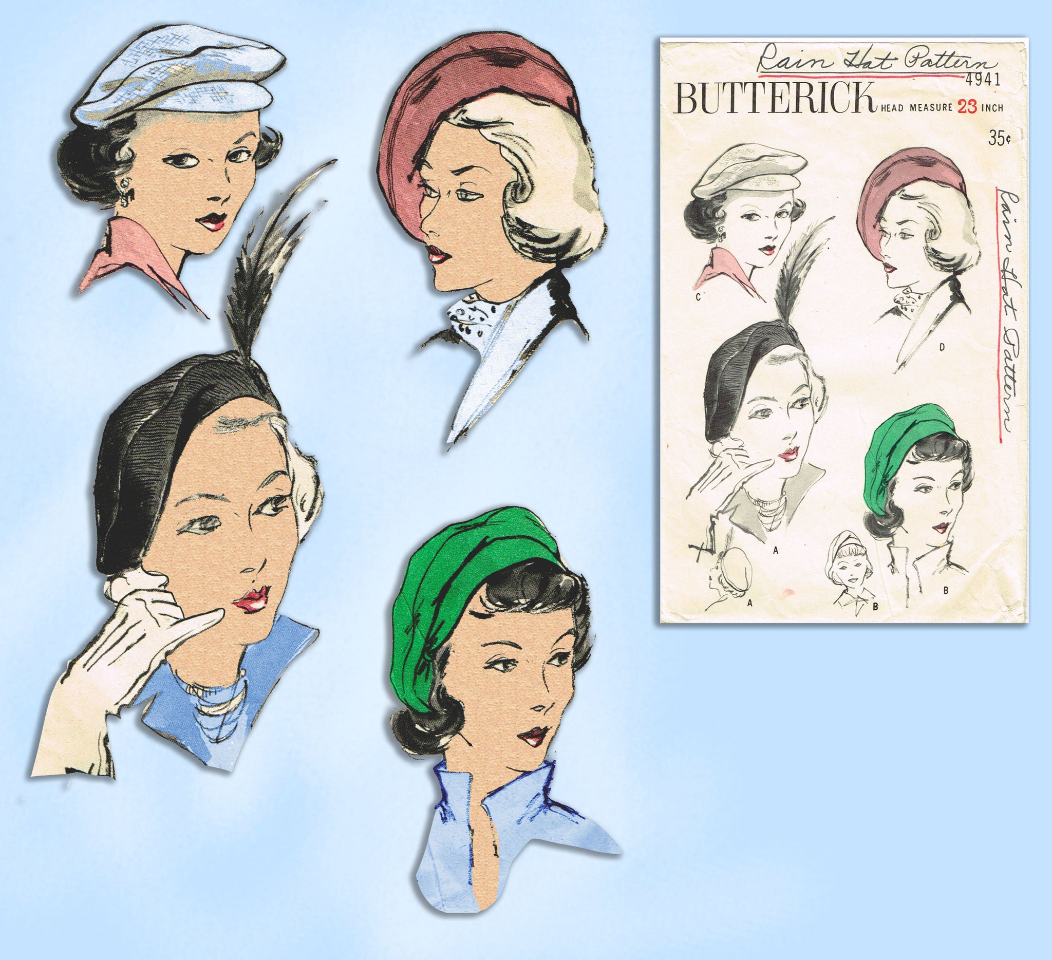 Butterick 4941: 1940s Misses Set of Beret Style Hats 23H Vintage Sewing Pattern
