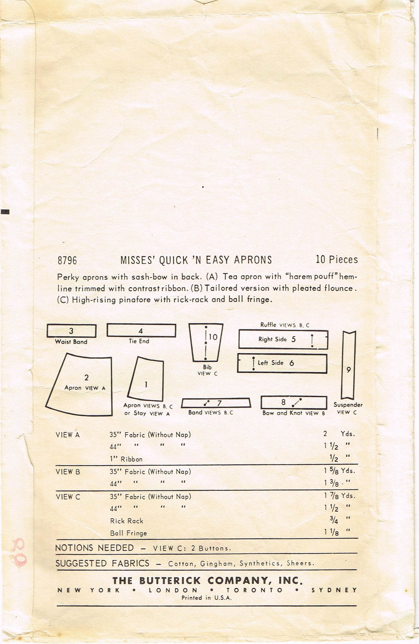 Butterick 8796: 1950s Darling Misses Apron Set Fits All Vintage Sewing Pattern